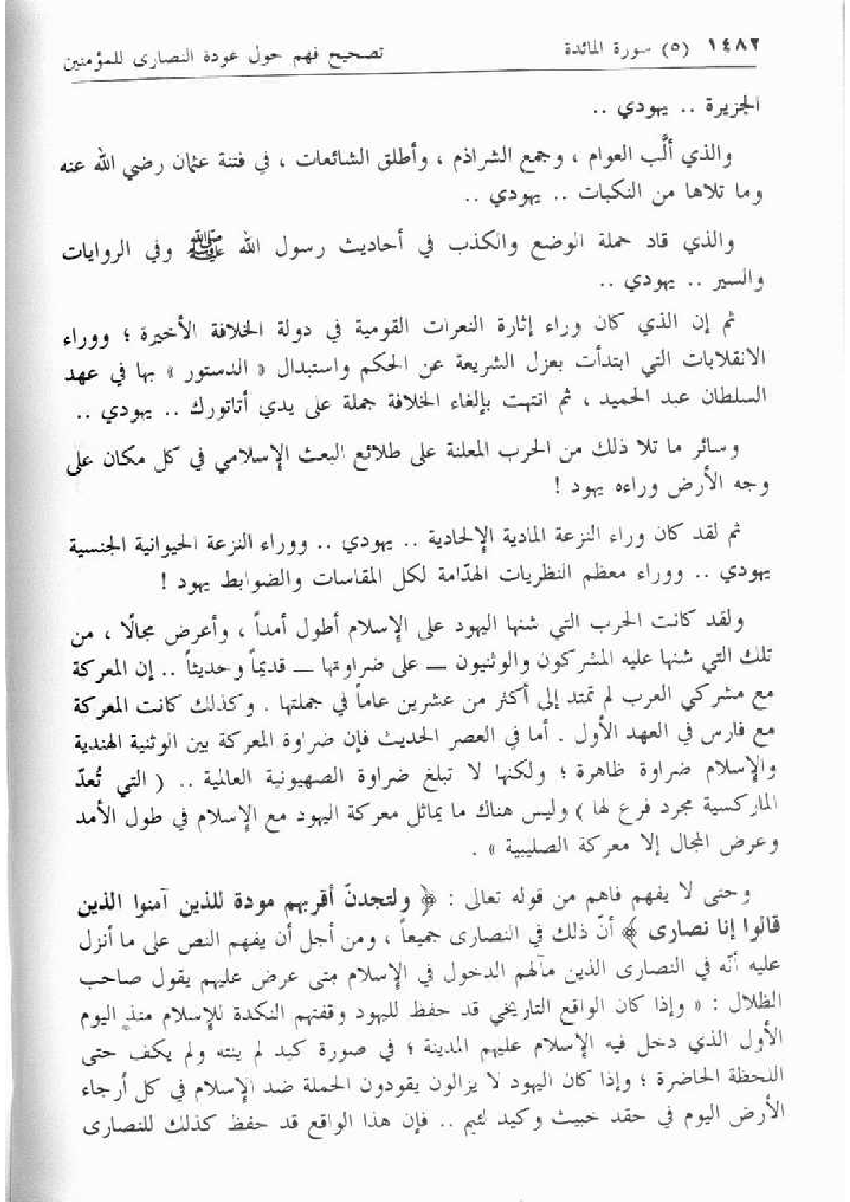 وحتى لا يفهم فاهم من قوله تعالى: وَلَتَجِدَنَّ أَقْرَبَهُمْ مَوَدَّةً لِلَّذِينَ آمَنُوا الَّذِينَ قالُوا إِنَّا نَصارى أنّ ذلك في النصارى جميعا، ومن أجل أن يفهم النص على ما أنزل عليه أنّه في النصارى الذين مآلهم الدخول في الإسلام متى عرض عليهم يقول صاحب الظلال: «وإذا كان الواقع التاريخي قد حفظ لليهود وقفتهم النكدة للإسلام منذ اليوم الأول الذي دخل فيه الإسلام عليهم المدينة؛ في صورة كيد لم ينته ولم يكف حتى اللحظة الحاضرة؛ وإذا كان اليهود لا يزالون يقودون الحملة ضد الإسلام في كل أرجاء الأرض اليوم في حقد خبيث وكيد لئيم .. فإن هذا الواقع قد حفظ كذلك للنصارى