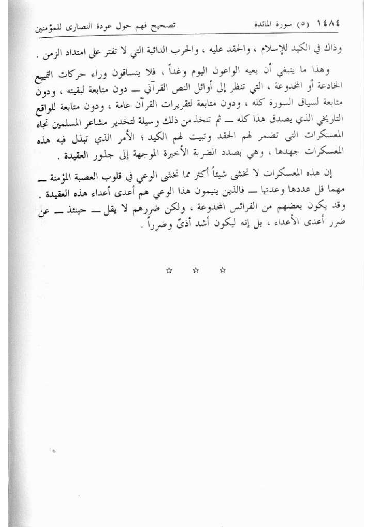 وهذا ما ينبغي أن يعيه الواعون اليوم وغدا، فلا ينساقون وراء حركات التمييع الخادعة أو المخدوعة، التي تنظر إلى أوائل النص القرآني- دون متابعة لبقيته، ودون متابعة لسياق السورة كله، ودون متابعة لتقريرات القرآن عامة، ودون متابعة للواقع التاريخي الذي يصدق هذا كله- ثم تتخذ من ذلك وسيلة لتخدير مشاعر المسلمين تجاه المعسكرات التى تضمر لهم الحقد وتبيت لهم الكيد؛ الأمر الذي تبذل فيه هذه المعسكرات جهدها، وهي بصدد الضربة الأخيرة الموجهة إلى جذور العقيدة.