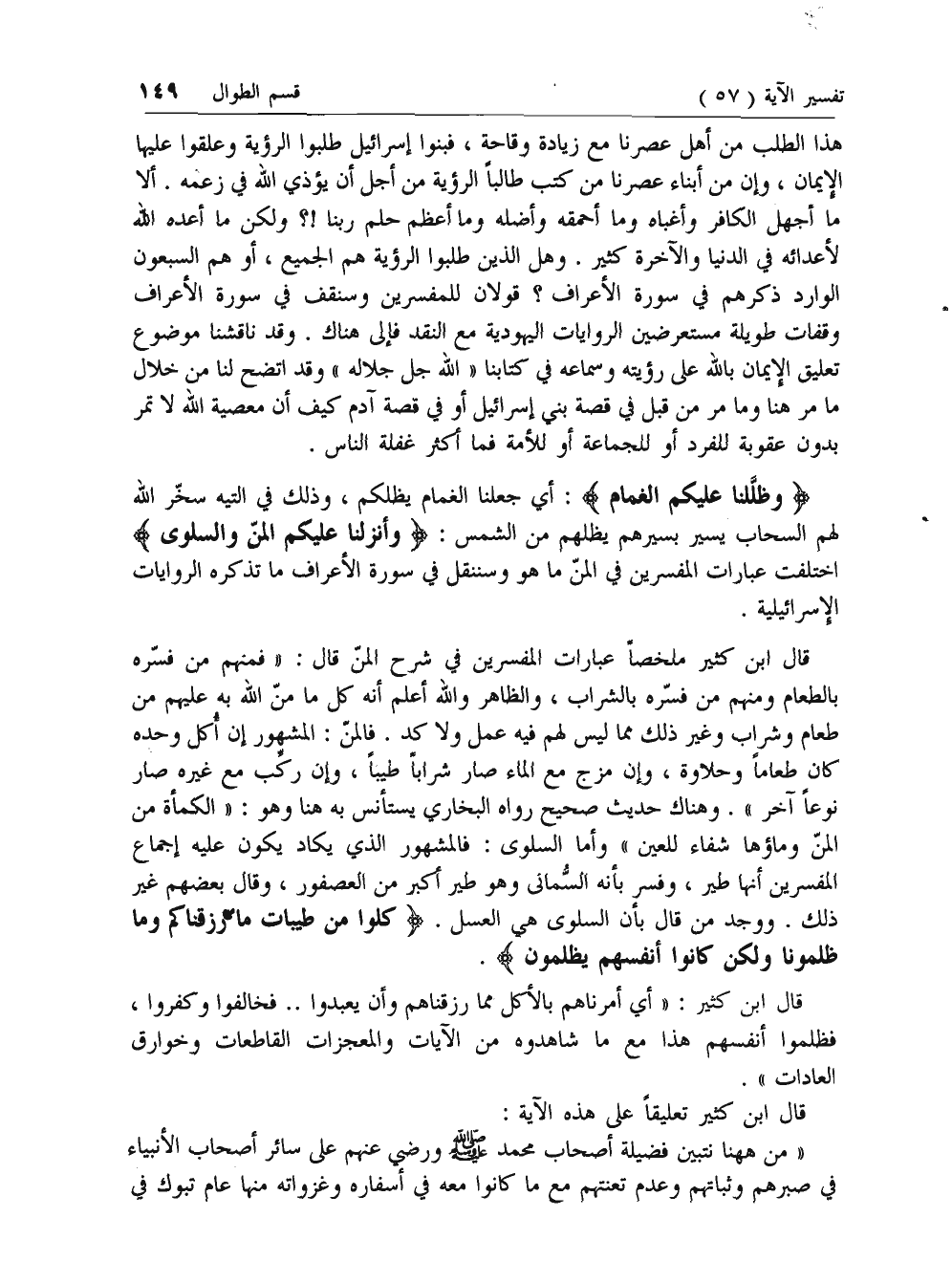 هذا الطلب من أهل عصرنا مع زيادة وقاحة، فبنوا إسرائيل طلبوا الرؤية وعلقوا عليها الإيمان، وإن من أبناء عصرنا من كتب طالبا الرؤية من أجل أن يؤذي الله في زعمه. ألا ما أجهل الكافر وأغباه وما أحمقه وأضله وما أعظم حلم ربنا!؟ ولكن ما أعده الله لأعدائه في الدنيا والآخرة كثير. وهل الذين طلبوا الرؤية هم الجميع، أو هم السبعون الوارد ذكرهم في سورة الأعراف؟ قولان للمفسرين وسنقف في سورة الأعراف وقفات طويلة مستعرضين الروايات اليهودية مع النقد فإلى هناك. وقد ناقشنا موضوع تعليق الإيمان بالله على رؤيته وسماعه في كتابنا «الله جل جلاله» وقد اتضح لنا من خلال ما مر هنا وما مر من قبل في قصة بني إسرائيل أو في قصة آدم كيف أن معصية الله لا تمر بدون عقوبة للفرد أو للجماعة أو للأمة فما أكثر غفلة الناس.