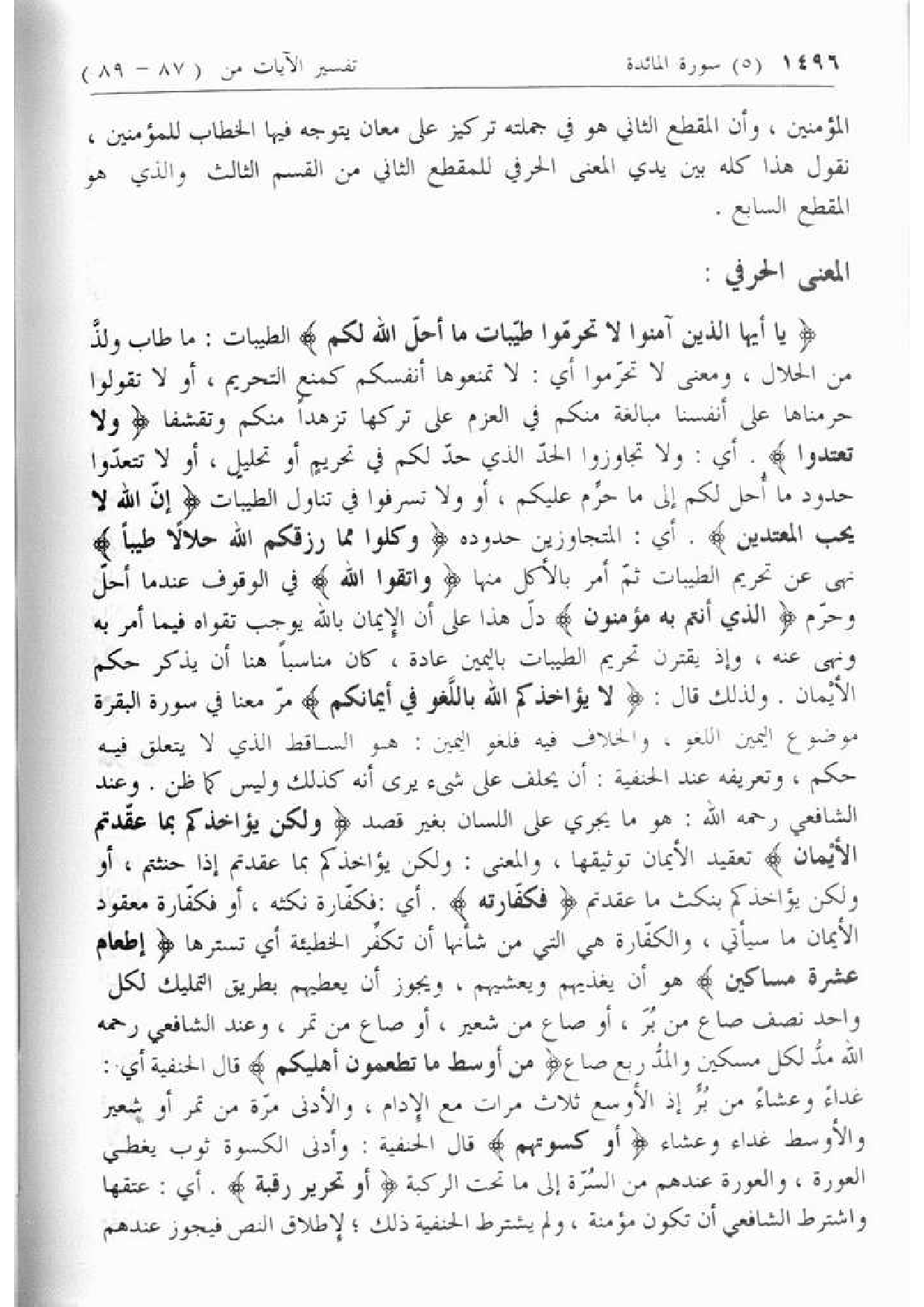 ولذلك قال: لا يُؤاخِذُكُمُ اللَّهُ بِاللَّغْوِ فِي أَيْمانِكُمْ مرّ معنا في سورة البقرة موضوع اليمين اللغو، والخلاف فيه فلغو اليمين: هو الساقط الذي لا يتعلق فيه حكم، وتعريفه عند الحنفية: أن يحلف على شئ يرى أنه كذلك وليس كما ظن. وعند الشافعي رحمه الله: هو ما يجري على اللسان بغير قصد وَلكِنْ يُؤاخِذُكُمْ بِما عَقَّدْتُمُ الْأَيْمانَ تعقيد الأيمان توثيقها، والمعنى: ولكن يؤاخذكم بما عقدتم إذا حنثتم، أو ولكن يؤاخذكم بنكث ما عقدتم فَكَفَّارَتُهُ. أي: فكفّارة نكثه، أو فكفّارة معقود الأيمان ما سيأتي، والكفّارة هي التي من شأنها أن تكفّر الخطيئة أي تسترها إِطْعامُ عَشَرَةِ مَساكِينَ هو أن يغذيهم ويعشيهم، ويجوز أن يعطيهم بطريق التمليك لكل واحد نصف صاع من برّ، أو صاع من شعير، أو صاع من تمر، وعند الشافعي رحمه الله مدّ لكل مسكين والمدّ ربع صاع مِنْ أَوْسَطِ ما تُطْعِمُونَ أَهْلِيكُمْ قال الحنفية أي: