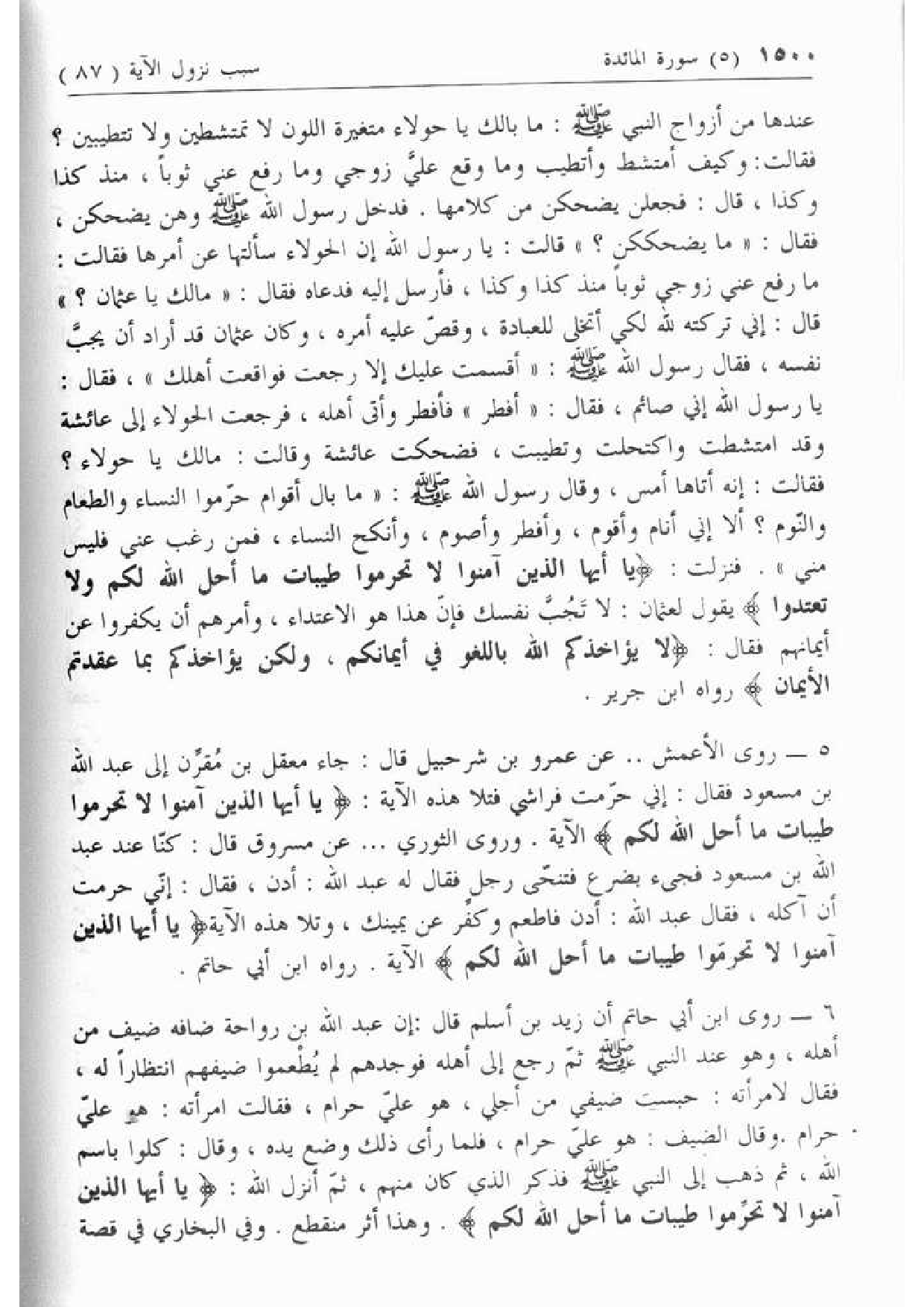 فقالت: إنه أتاها أمس، وقال رسول الله صلّى الله عليه وسلّم: «ما بال أقوام حرّموا النساء والطعام والنّوم؟ ألا إني أنام وأقوم، وأفطر وأصوم، وأنكح النساء، فمن رغب عني فليس مني». فنزلت: يا أَيُّهَا الَّذِينَ آمَنُوا لا تُحَرِّمُوا طَيِّباتِ ما أَحَلَّ اللَّهُ لَكُمْ وَلا تَعْتَدُوا يقول لعثمان: لا تجبّ نفسك فإنّ هذا هو الاعتداء، وأمرهم أن يكفروا عن أيمانهم فقال: لا يُؤاخِذُكُمُ اللَّهُ بِاللَّغْوِ فِي أَيْمانِكُمْ، وَلكِنْ يُؤاخِذُكُمْ بِما عَقَّدْتُمُ الْأَيْمانَ رواه ابن جرير.