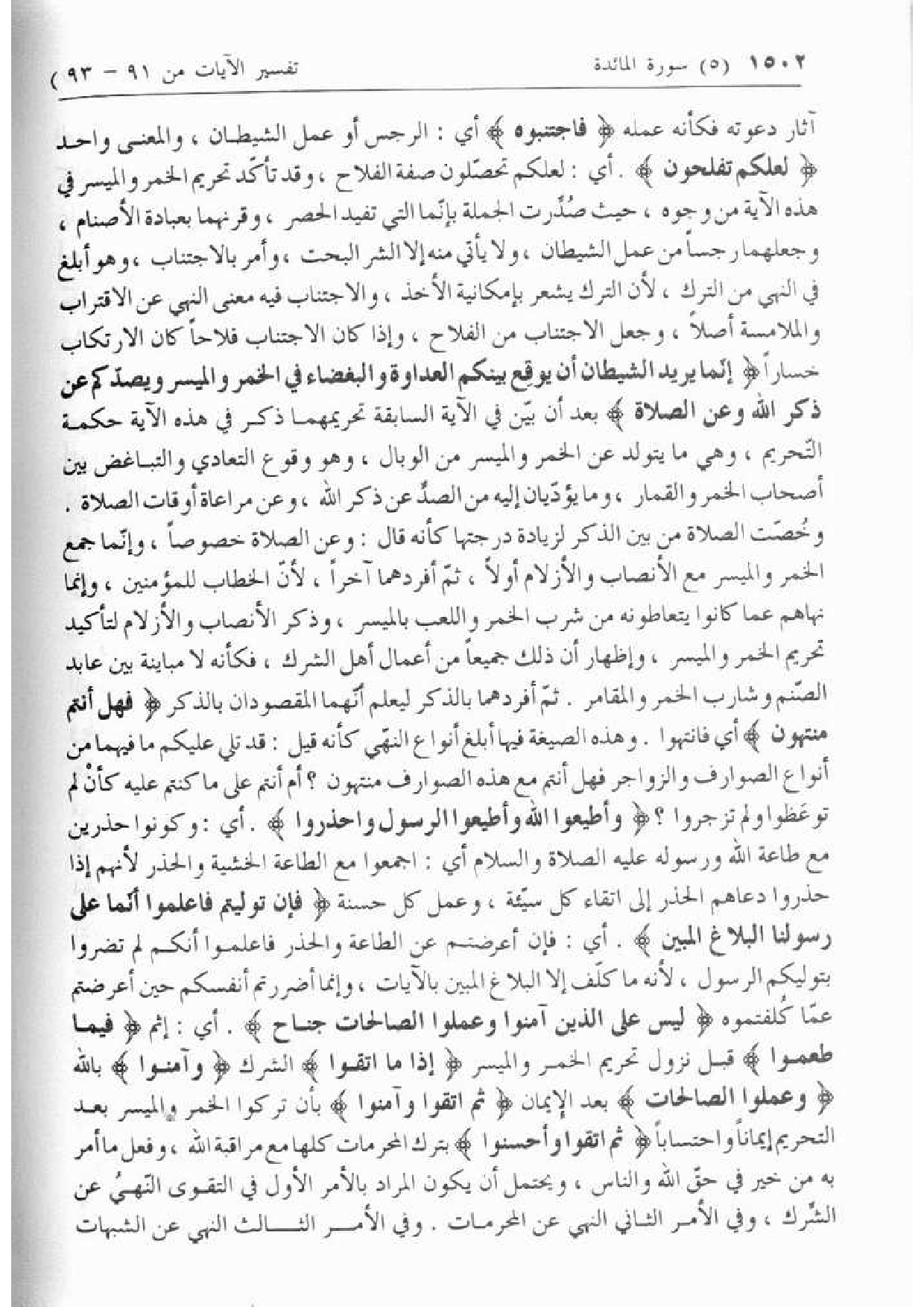 آثار دعوته فكأنه عمله فَاجْتَنِبُوهُ أي: الرجس أو عمل الشيطان، والمعنى واحد لَعَلَّكُمْ تُفْلِحُونَ. أي: لعلكم تحصّلون صفة الفلاح، وقد تأكّد تحريم الخمر والميسر في هذه الآية من وجوه، حيث صدّرت الجملة بإنّما التي تفيد الحصر، وقرنهما بعبادة الأصنام، وجعلهما رجسا من عمل الشيطان، ولا يأتي منه إلا الشر البحت، وأمر بالاجتناب، وهو أبلغ في النهي من الترك، لأن الترك يشعر بإمكانية الأخذ، والاجتناب فيه معنى النهي عن الاقتراب والملامسة أصلا، وجعل الاجتناب من الفلاح، وإذا كان الاجتناب فلاحا كان الارتكاب خسارا