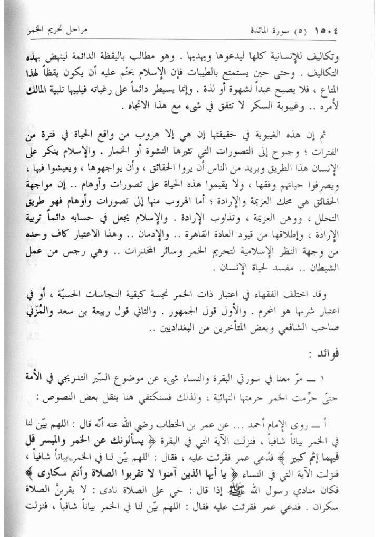 أ- روى الإمام أحمد ... عن عمر بن الخطاب رضي الله عنه أنّه قال: اللهم بيّن لنا في الخمر بيانا شافيا، فنزلت الآية التي في البقرة يَسْئَلُونَكَ عَنِ الْخَمْرِ وَالْمَيْسِرِ قُلْ فِيهِما إِثْمٌ كَبِيرٌ فدعي عمر فقرئت عليه، فقال: اللهم بيّن لنا في الخمر بيانا شافيا، فنزلت الآية التي في النساء يا أَيُّهَا الَّذِينَ آمَنُوا لا تَقْرَبُوا الصَّلاةَ وَأَنْتُمْ سُكارى فكان منادي رسول الله صلّى الله عليه وسلّم إذا قال: حي على الصلاة نادى: لا يقربنّ الصلاة سكران. فدعي عمر فقرئت عليه فقال: اللهم بيّن لنا في الخمر بيانا شافيا، فنزلت
