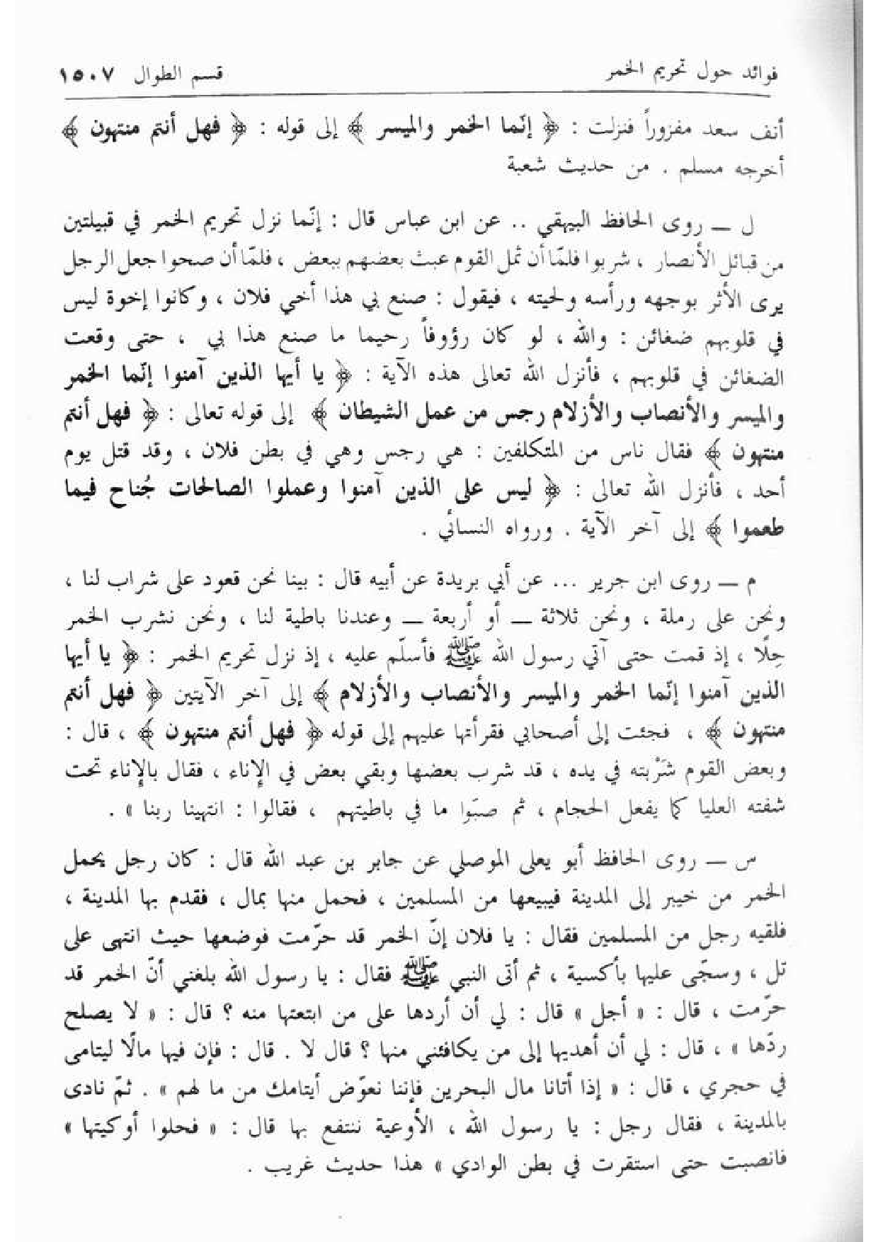 ل- روى الحافظ البيهقي .. عن ابن عباس قال: إنّما نزل تحريم الخمر في قبيلتين من قبائل الأنصار، شربوا فلمّا أن ثمل القوم عبث بعضهم ببعض، فلمّا أن صحوا جعل الرجل يرى الأثر بوجهه ورأسه ولحيته، فيقول: صنع بي هذا أخي فلان، وكانوا إخوة ليس في قلوبهم ضغائن: والله، لو كان رءوفا رحيما ما صنع هذا بي، حتى وقعت الضغائن في قلوبهم، فأنزل الله تعالى هذه الآية: يا أَيُّهَا الَّذِينَ آمَنُوا إِنَّمَا الْخَمْرُ وَالْمَيْسِرُ وَالْأَنْصابُ وَالْأَزْلامُ رِجْسٌ مِنْ عَمَلِ الشَّيْطانِ إلى قوله تعالى: فَهَلْ أَنْتُمْ مُنْتَهُونَ فقال ناس من المتكلفين: هي رجس وهي في بطن فلان، وقد قتل يوم أحد، فأنزل الله تعالى: لَيْسَ عَلَى الَّذِينَ آمَنُوا وَعَمِلُوا الصَّالِحاتِ جُناحٌ فِيما طَعِمُوا إلى آخر الآية. ورواه النسائي.