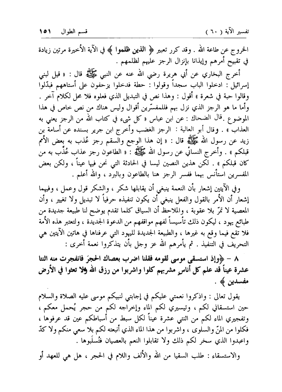 وفي الآيتين إشعار بأن النعمة ينبغي أن يقابلها شكر، والشكر قول وعمل، وفيهما إشعار أن الأمر بالقول والفعل ينبغي أن يكون تنفيذه حرفيا لا تبديل ولا تغيير، وأن المعصية لا تمر بلا عقوبة، والملاحظ أن السياق كلما تقدم يوضح لنا طبيعة جديدة من طبائع يهود، ليكون ذلك تأسيسا لفهم مواقفهم من الدعوة الجديدة، ولتعتبر هذه الأمة فلا تقع فيما وقع به غيرها، والطبيعة الجديدة لليهود التي عرفناها في هاتين الآيتين هي التحريف في التنفيذ. ثم يأمرهم الله عزّ وجل بأن يتذكروا نعمة أخرى: