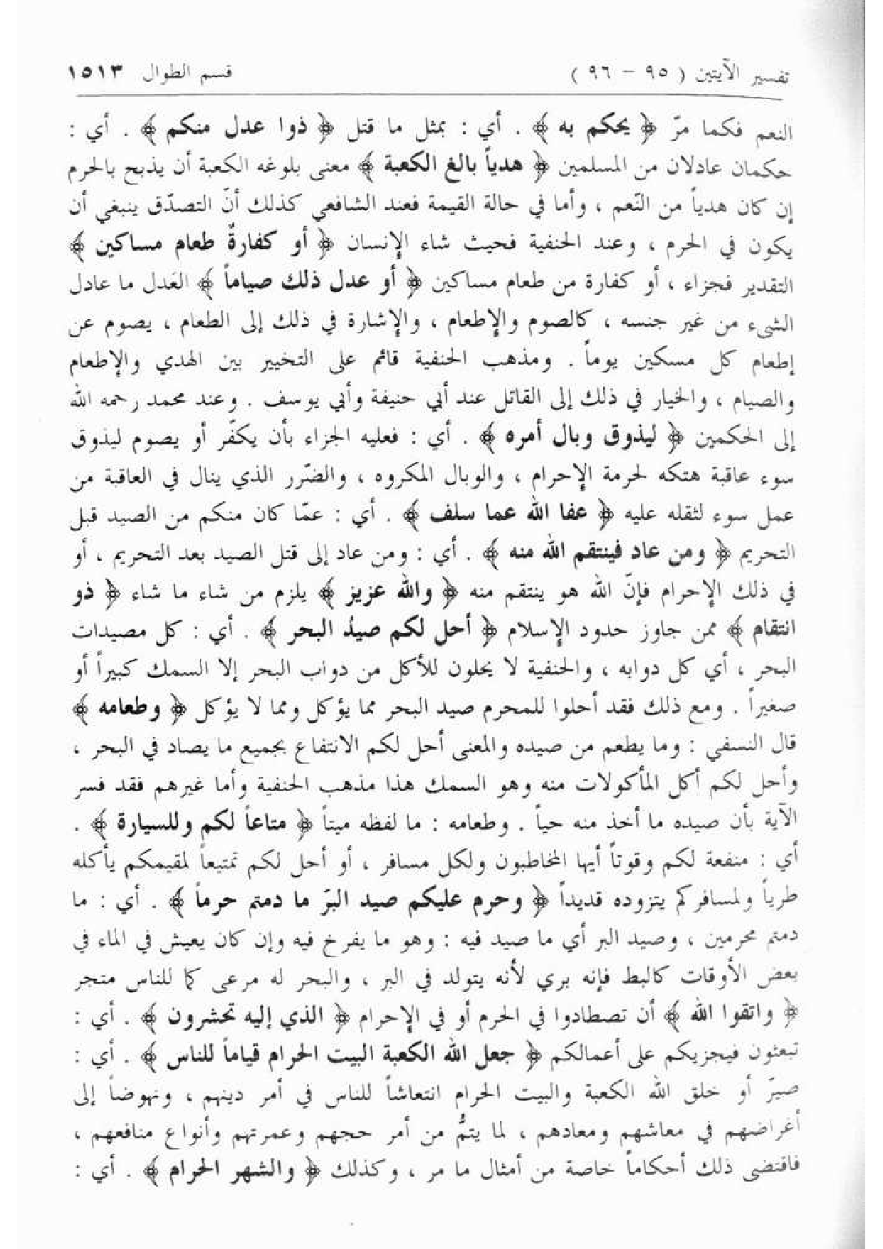 حكمان عادلان من المسلمين هَدْياً بالِغَ الْكَعْبَةِ معنى بلوغه الكعبة أن يذبح بالحرم إن كان هديا من النّعم، وأما في حالة القيمة فعند الشافعي كذلك أنّ التصدّق ينبغي أن يكون في الحرم، وعند الحنفية فحيث شاء الإنسان أَوْ كَفَّارَةٌ طَعامُ مَساكِينَ التقدير فجزاء، أو كفارة من طعام مساكين أَوْ عَدْلُ ذلِكَ صِياماً العدل ما عادل الشئ من غير جنسه، كالصوم والإطعام، والإشارة في ذلك إلى الطعام، يصوم عن إطعام كل مسكين يوما. ومذهب الحنفية قائم على التخيير بين الهدي والإطعام والصيام، والخيار في ذلك إلى القاتل عند أبي حنيفة وأبي يوسف. وعند محمد رحمه الله إلى الحكمين لِيَذُوقَ وَبالَ أَمْرِهِ. أي: فعليه الجزاء بأن يكفّر أو يصوم ليذوق سوء عاقبة هتكه لحرمة الإحرام، والوبال المكروه، والضّرر الذي ينال في العاقبة من عمل سوء لثقله عليه عَفَا اللَّهُ عَمَّا سَلَفَ. أي: عمّا كان منكم من الصيد قبل التحريم وَمَنْ عادَ فَيَنْتَقِمُ اللَّهُ مِنْهُ. أي: ومن عاد إلى قتل الصيد بعد التحريم، أو في ذلك الإحرام فإنّ الله هو ينتقم منه وَاللَّهُ عَزِيزٌ يلزم من شاء ما شاء ذُو انْتِقامٍ ممن جاوز حدود الإسلام