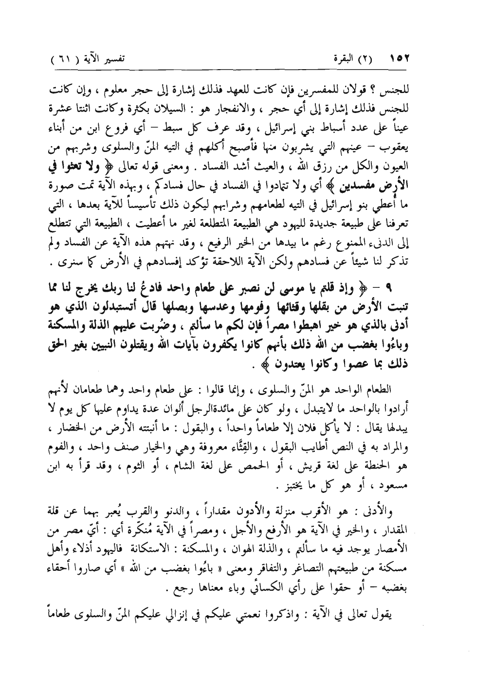للجنس؟ قولان للمفسرين فإن كانت للعهد فذلك إشارة إلى حجر معلوم، وإن كانت للجنس فذلك إشارة إلى أي حجر، والانفجار هو: السيلان بكثرة وكانت اثنتا عشرة عينا على عدد أسباط بني إسرائيل، وقد عرف كل سبط- أي فروع ابن من أبناء يعقوب- عينهم التي يشربون منها فأصبح أكلهم في التيه المن والسلوى وشربهم من العيون والكل من رزق الله، والعيث أشد الفساد. ومعنى قوله تعالى وَلا تَعْثَوْا فِي الْأَرْضِ مُفْسِدِينَ أي ولا تتمادوا في الفساد في حال فسادكم، وبهذه الآية تمت صورة ما أعطي بنو إسرائيل في التيه لطعامهم وشرابهم ليكون ذلك تأسيسا للآية بعدها، التي تعرفنا على طبيعة جديدة لليهود هي الطبيعة المتطلعة لغير ما أعطيت، الطبيعة التي تتطلع إلى الدنئ الممنوع رغم ما بيدها من الخير الرفيع، وقد نهتهم هذه الآية عن الفساد ولم تذكر لنا شيئا عن فسادهم ولكن الآية اللاحقة تؤكد إفسادهم في الأرض كما سنرى.