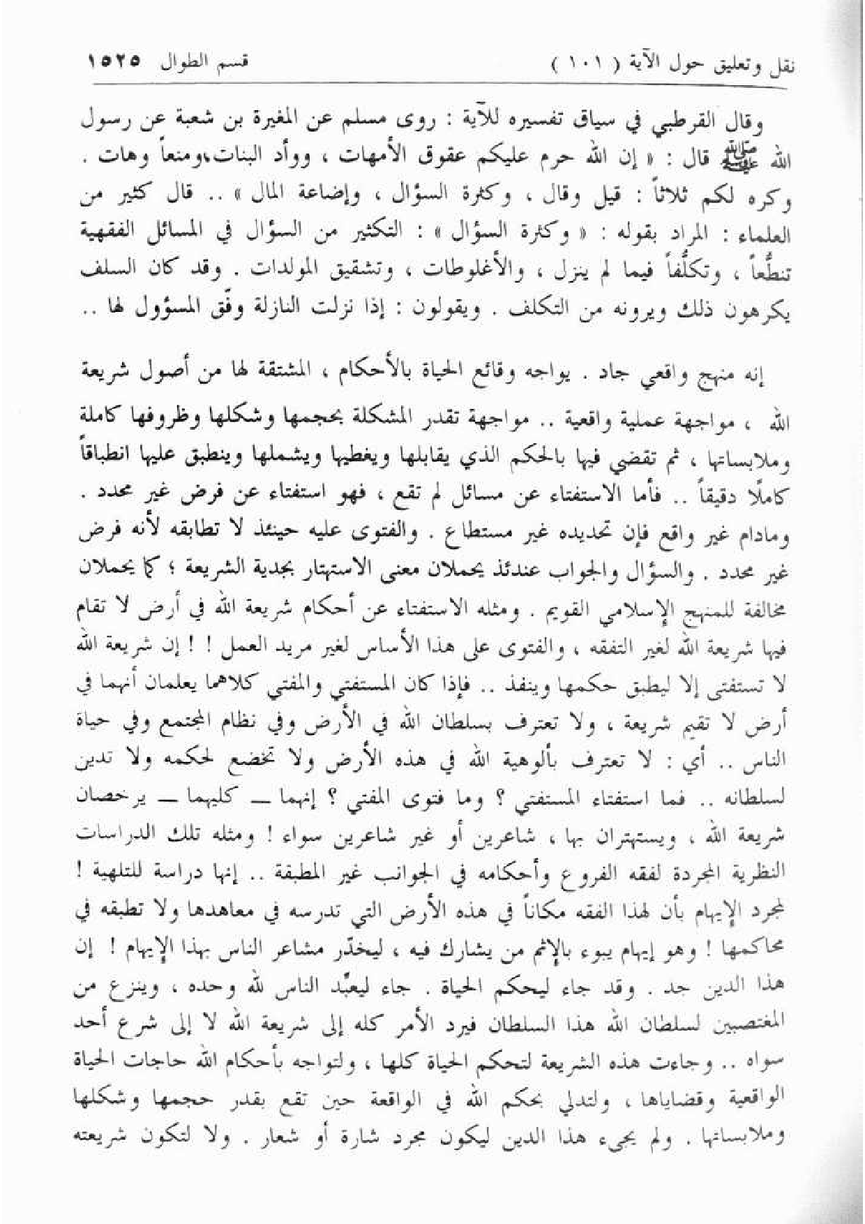 إنه منهج واقعي جاد. يواجه وقائع الحياة بالأحكام، المشتقة لها من أصول شريعة الله، مواجهة عملية واقعية .. مواجهة تقدر المشكلة بحجمها وشكلها وظروفها كاملة وملابساتها، ثم تقضي فيها بالحكم الذي يقابلها ويغطيها ويشملها وينطبق عليها انطباقا كاملا دقيقا .. فأما الاستفتاء عن مسائل لم تقع، فهو استفتاء عن فرض غير محدد.