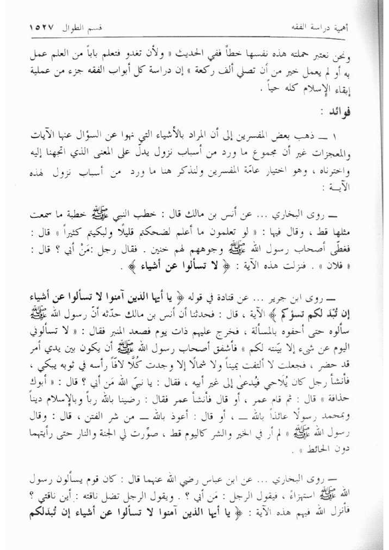 - روى ابن جرير ... عن قتادة في قوله يا أَيُّهَا الَّذِينَ آمَنُوا لا تَسْئَلُوا عَنْ أَشْياءَ إِنْ تُبْدَ لَكُمْ تَسُؤْكُمْ الآية، قال: فحدثنا أن أنس بن مالك حدّثه أنّ رسول الله صلّى الله عليه وسلّم سألوه حتى أحفوه بالمسألة، فخرج عليهم ذات يوم فصعد المنبر فقال: «لا تسألوني اليوم عن شئ إلا بيّنته لكم» فأشفق أصحاب رسول الله صلّى الله عليه وسلّم أن يكون بين يدي أمر قد حضر، فجعلت لا ألتفت يمينا ولا شمالا إلا وجدت كلّا لافّ رأسه في ثوبه يبكي، فأنشأ رجل كان يلاحي فيدعى إلى غير أبيه، فقال: يا نبيّ الله من أبي؟ قال: «أبوك حذافة» قال: ثم قام عمر، أو قال فأنشأ عمر فقال: رضينا بالله ربا وبالإسلام دينا وبمحمد رسولا عائذا بالله-، أو قال: أعوذ بالله- من شر الفتن، قال: وقال رسول الله صلّى الله عليه وسلّم «لم أر في الخير والشر كاليوم قط، صوّرت لي الجنة والنار حتى رأيتهما دون الحائط».