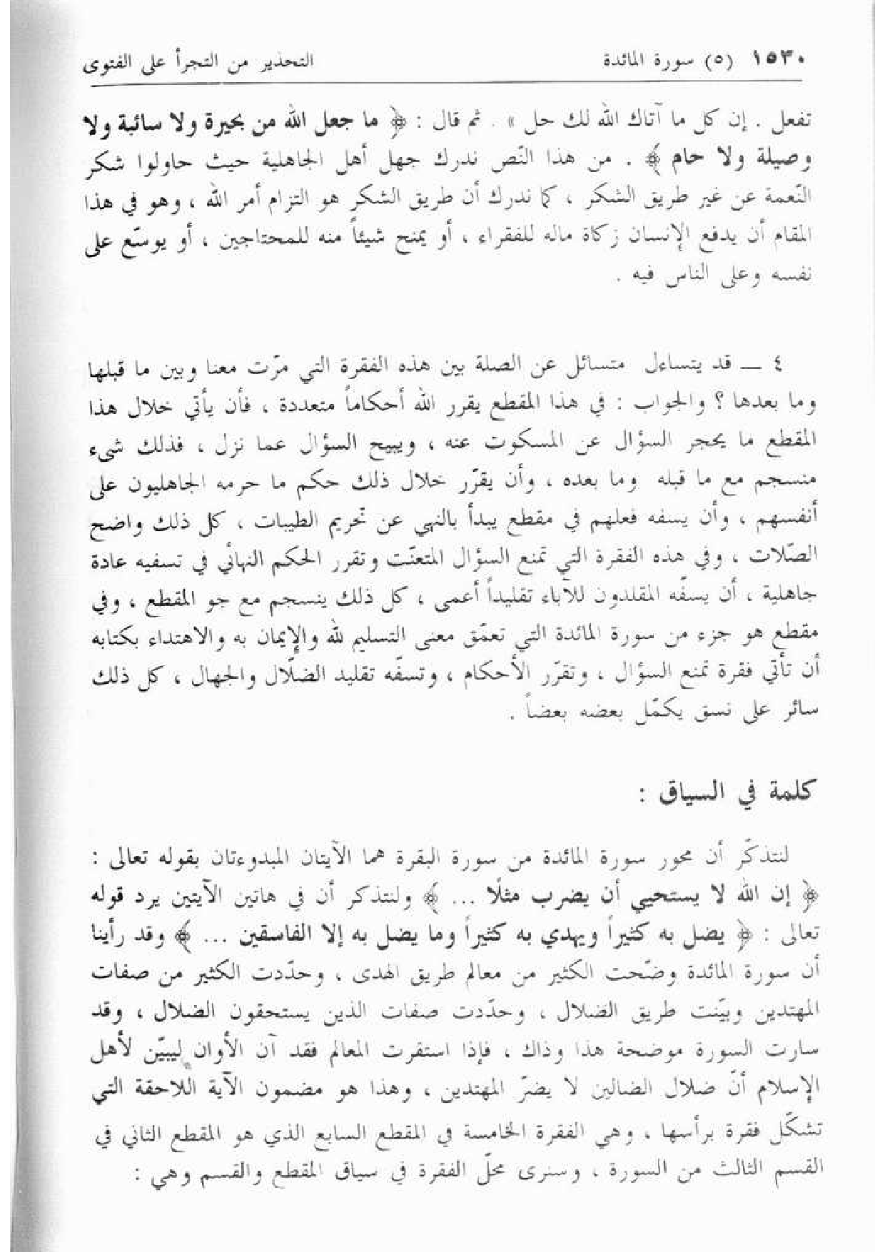 4 - قد يتساءل متسائل عن الصلة بين هذه الفقرة التي مرّت معنا وبين ما قبلها وما بعدها؟ والجواب: في هذا المقطع يقرر الله أحكاما متعددة، فإن يأتي خلال هذا المقطع ما يحجر السؤال عن المسكوت عنه، ويبيح السؤال عما نزل، فذلك شئ منسجم مع ما قبله وما بعده، وأن يقرّر خلال ذلك حكم ما حرمه الجاهليون على أنفسهم، وأن يسفه فعلهم في مقطع يبدأ بالنهي عن تحريم الطيبات، كل ذلك واضح الصّلات، وفي هذه الفقرة التي تمنع السؤال المتعنّت وتقرر الحكم النهائي في تسفيه عادة جاهلية، أن يسفّه المقلدون للآباء تقليدا أعمى، كل ذلك ينسجم مع جو المقطع، وفي مقطع هو جزء من سورة المائدة التي تعمّق معنى التسليم لله والإيمان به والاهتداء بكتابه أن تأتي فقرة تمنع السؤال، وتقرّر الأحكام، وتسفّه تقليد الضلّال والجهال، كل ذلك سائر على نسق يكمّل بعضه بعضا.