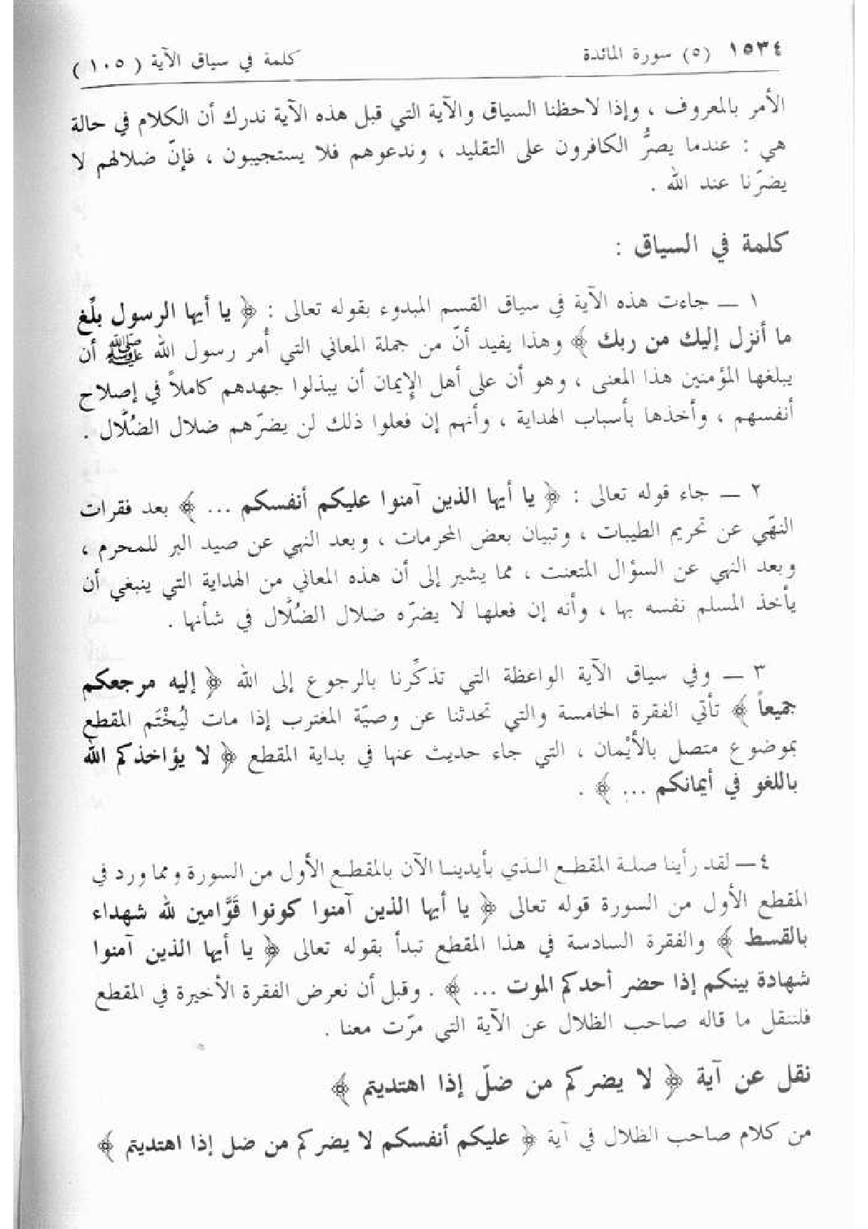 2 - جاء قوله تعالى: يا أَيُّهَا الَّذِينَ آمَنُوا عَلَيْكُمْ أَنْفُسَكُمْ ... بعد فقرات النّهي عن تحريم الطيبات، وتبيان بعض المحرمات، وبعد النهي عن صيد البر للمحرم، وبعد النهي عن السؤال المتعنت، مما يشير إلى أن هذه المعاني من الهداية التي ينبغي أن يأخذ المسلم نفسه بها، وأنه إن فعلها لا يضرّه ضلال الضلّال في شأنها.