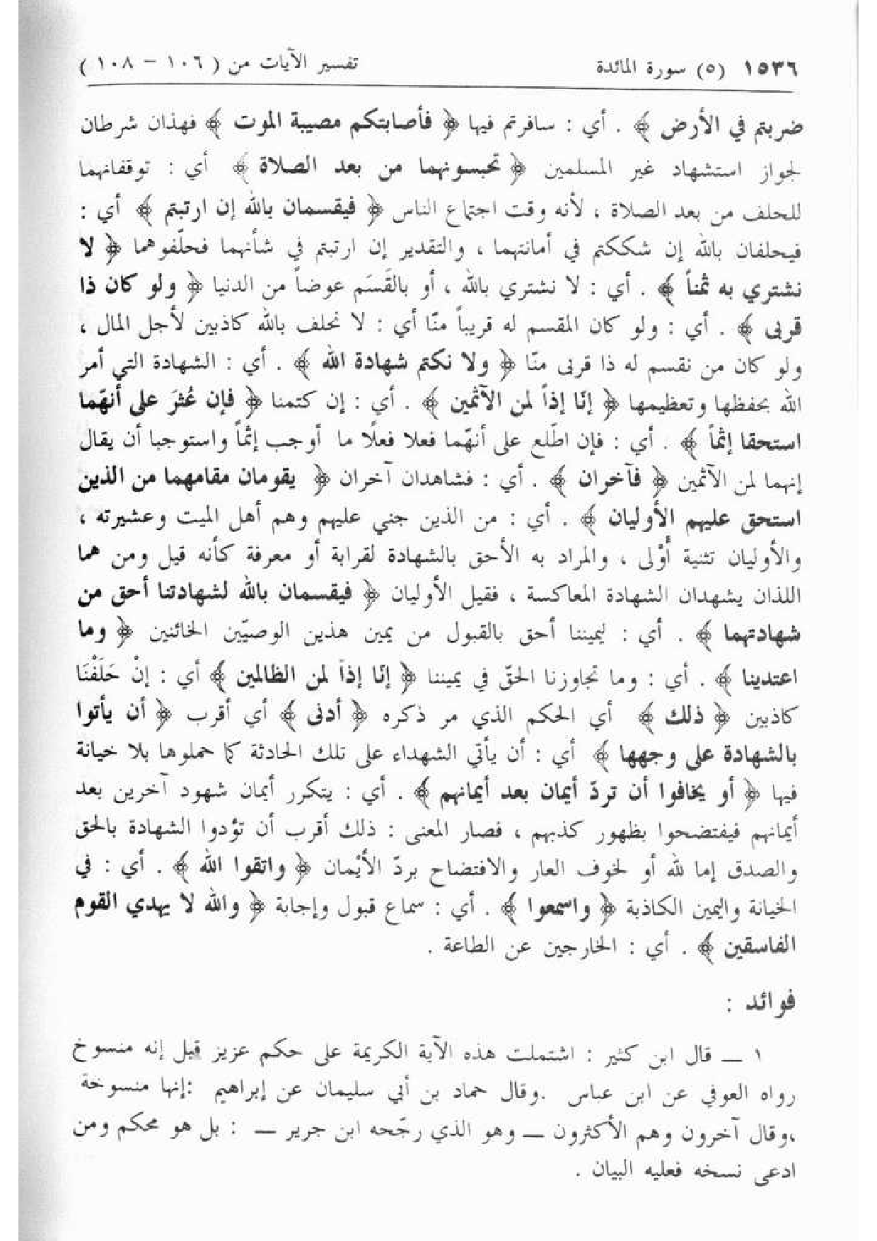 ضَرَبْتُمْ فِي الْأَرْضِ. أي: سافرتم فيها فَأَصابَتْكُمْ مُصِيبَةُ الْمَوْتِ فهذان شرطان لجواز استشهاد غير المسلمين تَحْبِسُونَهُما مِنْ بَعْدِ الصَّلاةِ أي: توقفونهما للحلف من بعد