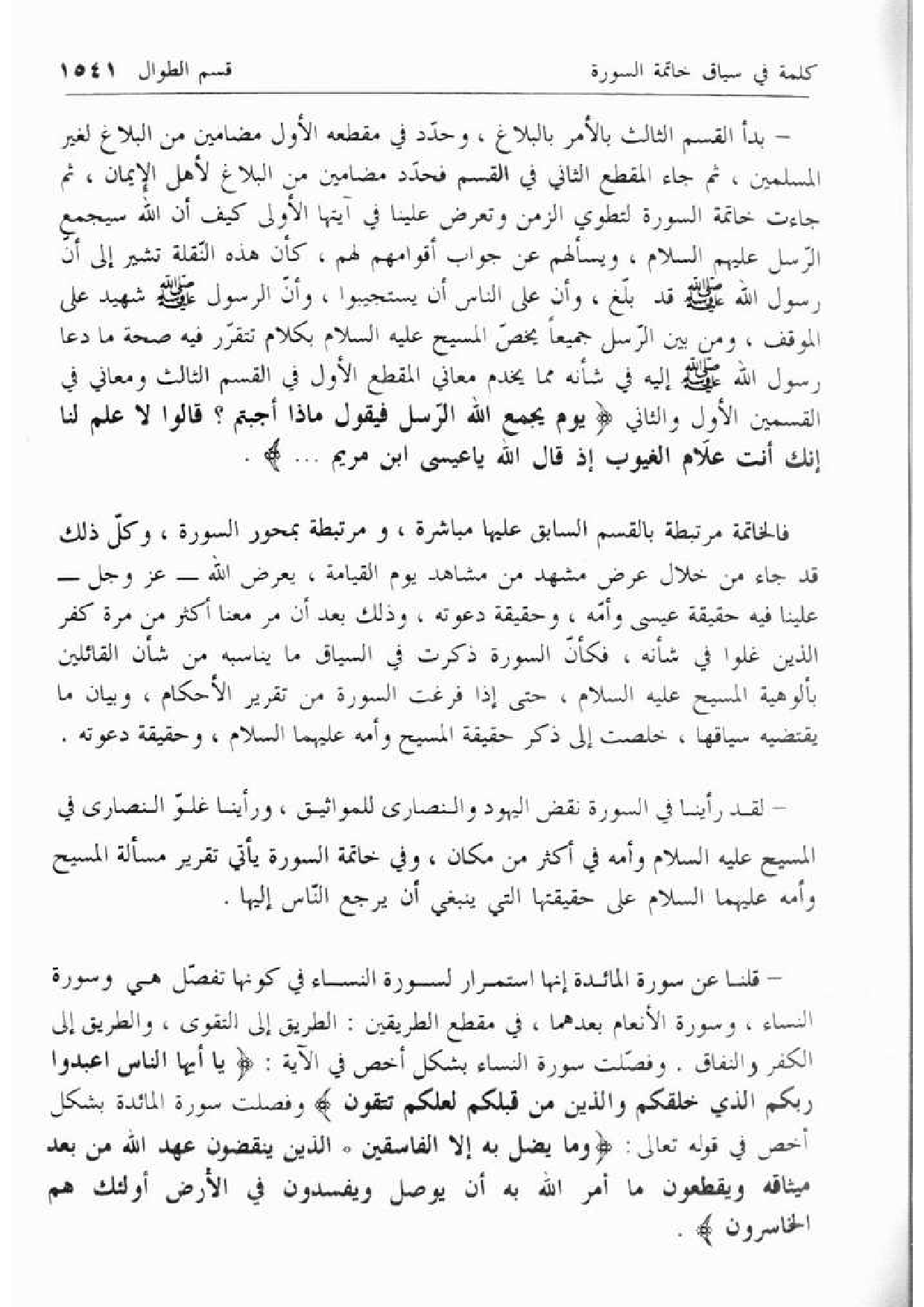 - بدأ القسم الثالث بالأمر بالبلاغ، وحدّد في مقطعه الأول مضامين من البلاغ لغير المسلمين، ثم جاء المقطع الثاني في القسم فحدّد مضامين من البلاغ لأهل الإيمان، ثم جاءت خاتمة السورة لتطوي الزمن وتعرض علينا في آيتها الأولى كيف أن الله سيجمع الرّسل عليهم السلام، ويسألهم عن جواب أقوامهم لهم، كأن هذه النّقلة تشير إلى أنّ رسول الله صلّى الله عليه وسلّم قد بلّغ، وأن على الناس أن يستجيبوا، وأنّ الرسول صلّى الله عليه وسلّم شهيد على الموقف، ومن بين الرّسل جميعا يخصّ المسيح عليه السلام بكلام تتقرّر فيه صحة ما دعا رسول الله صلّى الله عليه وسلّم إليه في شأنه مما يخدم معاني المقطع الأول في القسم الثالث ومعاني في القسمين الأول والثاني يَوْمَ يَجْمَعُ اللَّهُ الرُّسُلَ فَيَقُولُ ماذا أُجِبْتُمْ؟ قالُوا لا عِلْمَ لَنا إِنَّكَ أَنْتَ عَلَّامُ الْغُيُوبِ إِذْ قالَ اللَّهُ يا عِيسَى ابْنَ مَرْيَمَ ....