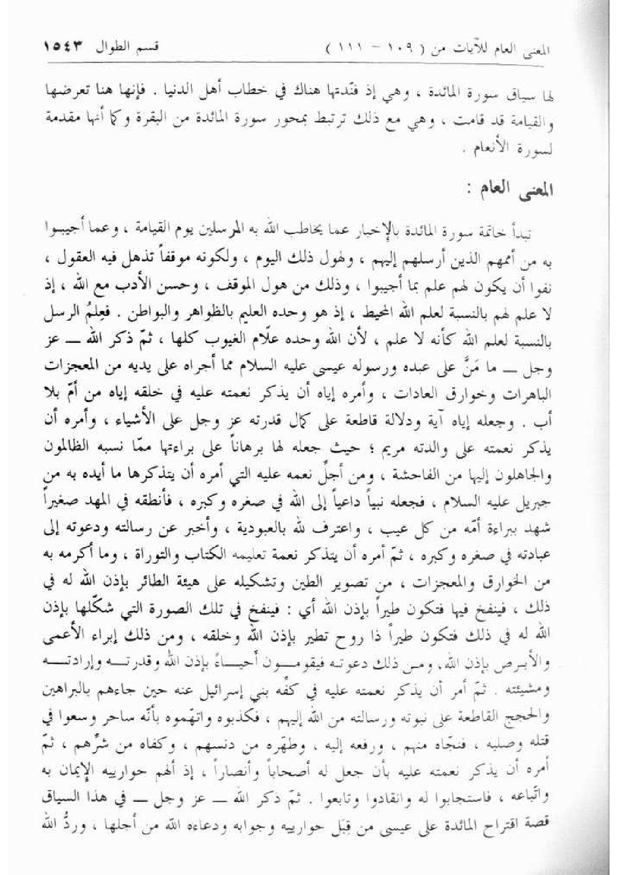 تبدأ خاتمة سورة المائدة بالإخبار عما يخاطب الله به المرسلين يوم القيامة، وعما أجيبوا به من أممهم الذين أرسلهم إليهم، ولهول ذلك اليوم، ولكونه موقفا تذهل فيه العقول، نفوا أن يكون لهم علم بما أجيبوا، وذلك من هول الموقف، وحسن الأدب مع الله، إذ لا علم لهم بالنسبة لعلم الله المحيط، إذ هو وحده العليم بالظواهر والبواطن. فعلم الرسل بالنسبة لعلم الله كأنه لا علم، لأن الله وحده علّام الغيوب كلها، ثمّ ذكر الله- عزّ وجل- ما منّ على عبده ورسوله عيسى عليه السلام مما أجراه على يديه من المعجزات الباهرات وخوارق العادات، وأمره إياه أن يذكر نعمته عليه في خلقه إياه من أمّ بلا أب. وجعله إياه آية ودلالة قاطعة على كمال قدرته عزّ وجل على الأشياء، وأمره أن يذكر نعمته على والدته مريم؛ حيث جعله لها برهانا على براءتها ممّا نسبه الظالمون والجاهلون إليها من الفاحشة، ومن أجلّ نعمه عليه التي أمره أن يتذكرها ما أيده به من جبريل عليه السلام، فجعله نبيا داعيا إلى الله في صغره وكبره، فأنطقه في المهد صغيرا شهد ببراءة أمّه من كل عيب، واعترف لله بالعبودية، وأخبر عن رسالته ودعوته إلى عبادته في صغره وكبره، ثمّ أمره أن يتذكر نعمة تعليمه الكتاب والتوراة، وما أكرمه به من الخوارق والمعجزات، من تصوير الطين وتشكيله على هيئة الطائر بإذن الله له في ذلك، فينفخ فيها فتكون طيرا بإذن الله أي: فينفخ في تلك الصورة التي شكّلها بإذن الله له في ذلك فتكون طيرا ذا روح تطير بإذن الله وخلقه، ومن ذلك إبراء الأعمى والأبرص بإذن الله، ومن ذلك دعوته فيقومون أحياء بإذن الله وقدرته وإرادته ومشيئته. ثمّ أمر أن يذكر نعمته عليه في كفّه بني إسرائيل عنه حين جاءهم بالبراهين والحجج القاطعة على نبوته ورسالته من الله إليهم، فكذبوه واتّهموه بأنّه ساحر وسعوا في قتله وصلبه، فنجّاه منهم، ورفعه إليه، وطهّره من دنسهم، وكفاه من شرّهم، ثمّ أمره أن يذكر نعمته عليه بأن جعل له أصحابا وأنصارا، إذ ألهم حوارييه الإيمان به واتّباعه، فاستجابوا له وانقادوا وتابعوا. ثمّ ذكر الله- عزّ وجل- في هذا السياق قصة اقتراح المائدة على عيسى من قبل حوارييه وجوابه ودعاءه الله من أجلها، وردّ الله