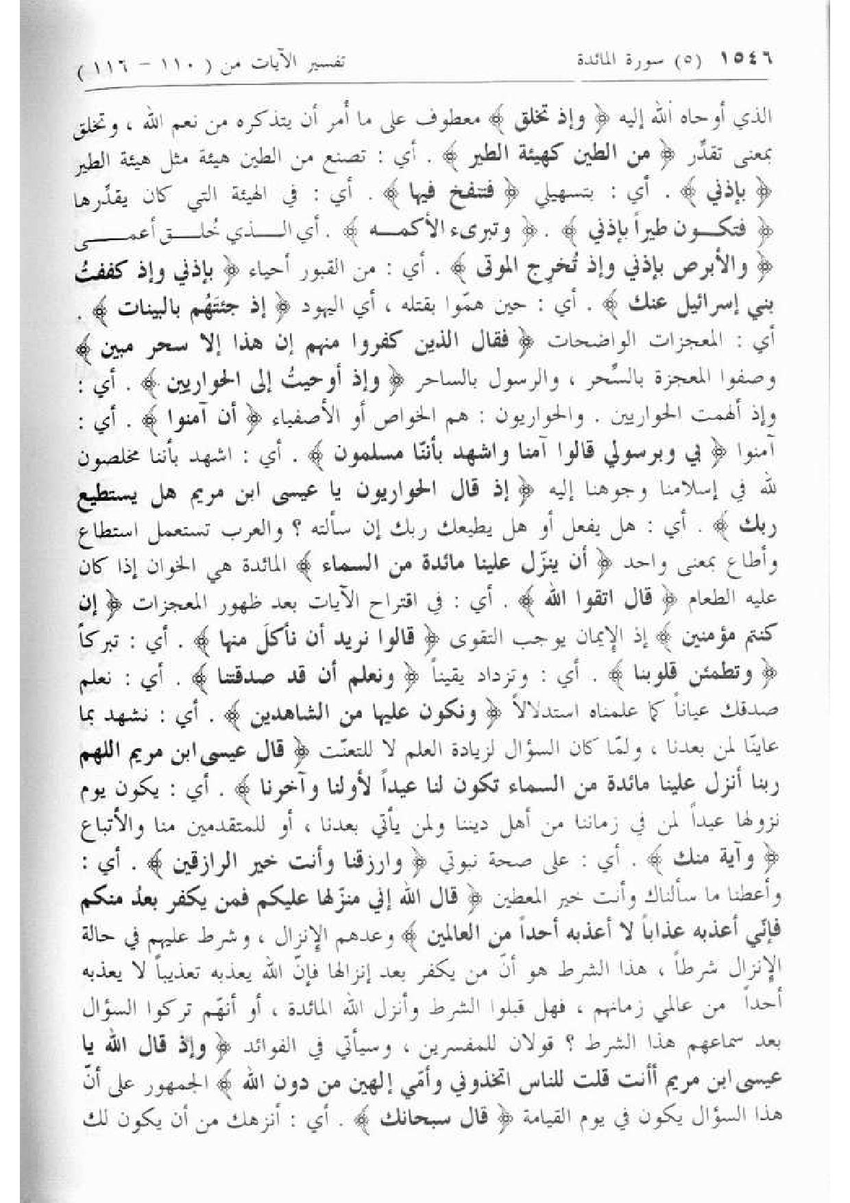 إِذْ قالَ الْحَوارِيُّونَ يا عِيسَى ابْنَ مَرْيَمَ هَلْ يَسْتَطِيعُ رَبُّكَ. أي: هل يفعل أو هل يطيعك ربك إن سألته؟ والعرب تستعمل استطاع وأطاع بمعنى واحد أَنْ يُنَزِّلَ عَلَيْنا مائِدَةً مِنَ السَّماءِ المائدة هي الخوان إذا كان عليه الطعام قالَ اتَّقُوا اللَّهَ. أي: في اقتراح الآيات بعد ظهور المعجزات إِنْ كُنْتُمْ مُؤْمِنِينَ إذ الإيمان يوجب التقوى