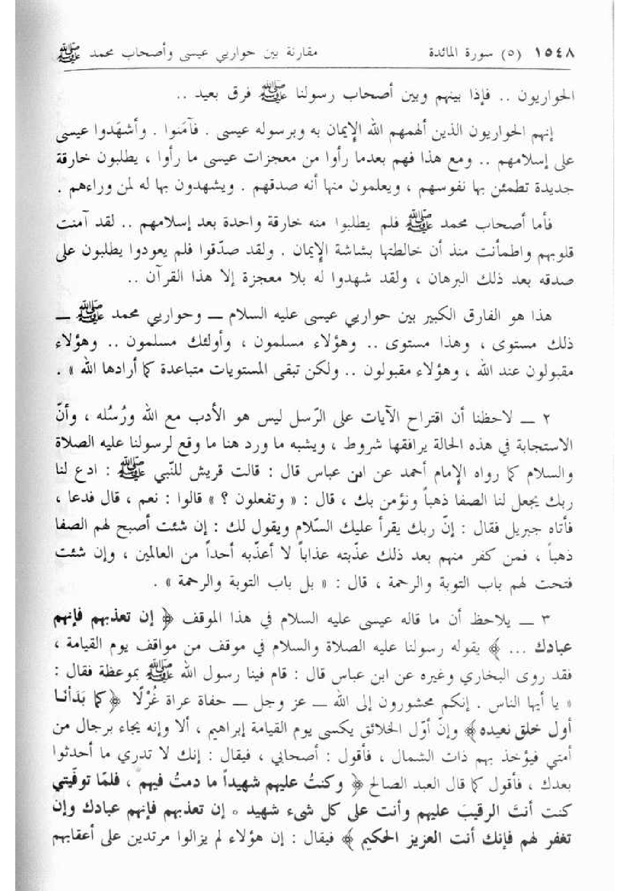 يلاحظ أن ما قاله عيسى عليه السلام في هذا الموقف إِنْ تُعَذِّبْهُمْ فَإِنَّهُمْ عِبادُكَ ... يقوله رسولنا عليه الصلاة والسلام في موقف من مواقف يوم القيامة، فقد روى البخاري وغيره عن ابن عباس قال: قام فينا رسول الله صلّى الله عليه وسلّم بموعظة فقال: