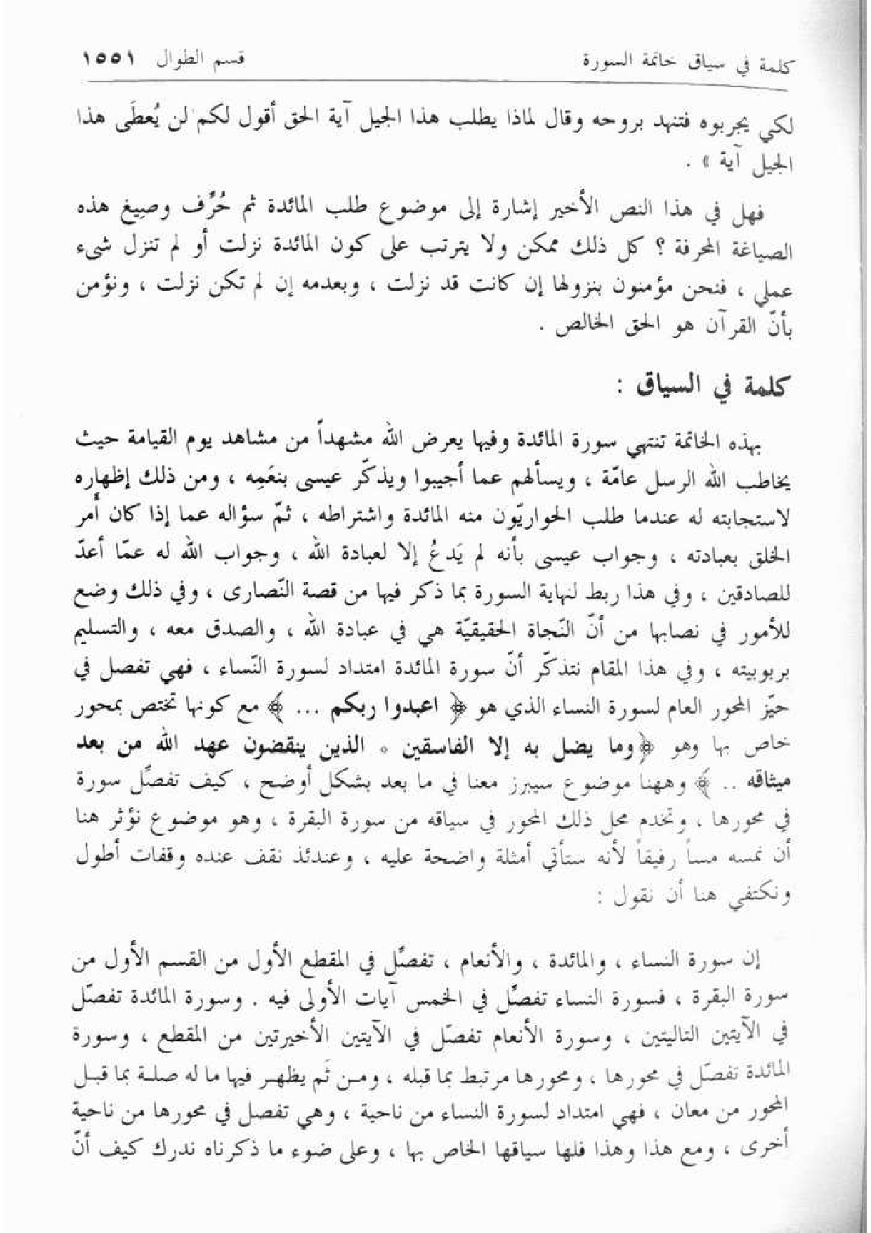 في الآيتين التاليتين، وسورة الأنعام تفصّل في الآيتين الأخيرتين من المقطع، وسورة المائدة تفصّل في محورها، ومحورها مرتبط بما قبله، ومن ثم يظهر فيها ما له صلة بما قبل المحور من معان، فهي امتداد لسورة النساء من ناحية، وهي تفصل في محورها من ناحية أخرى، ومع هذا وهذا فلها سياقها الخاص بها، وعلى ضوء ما ذكرناه ندرك كيف أنّ