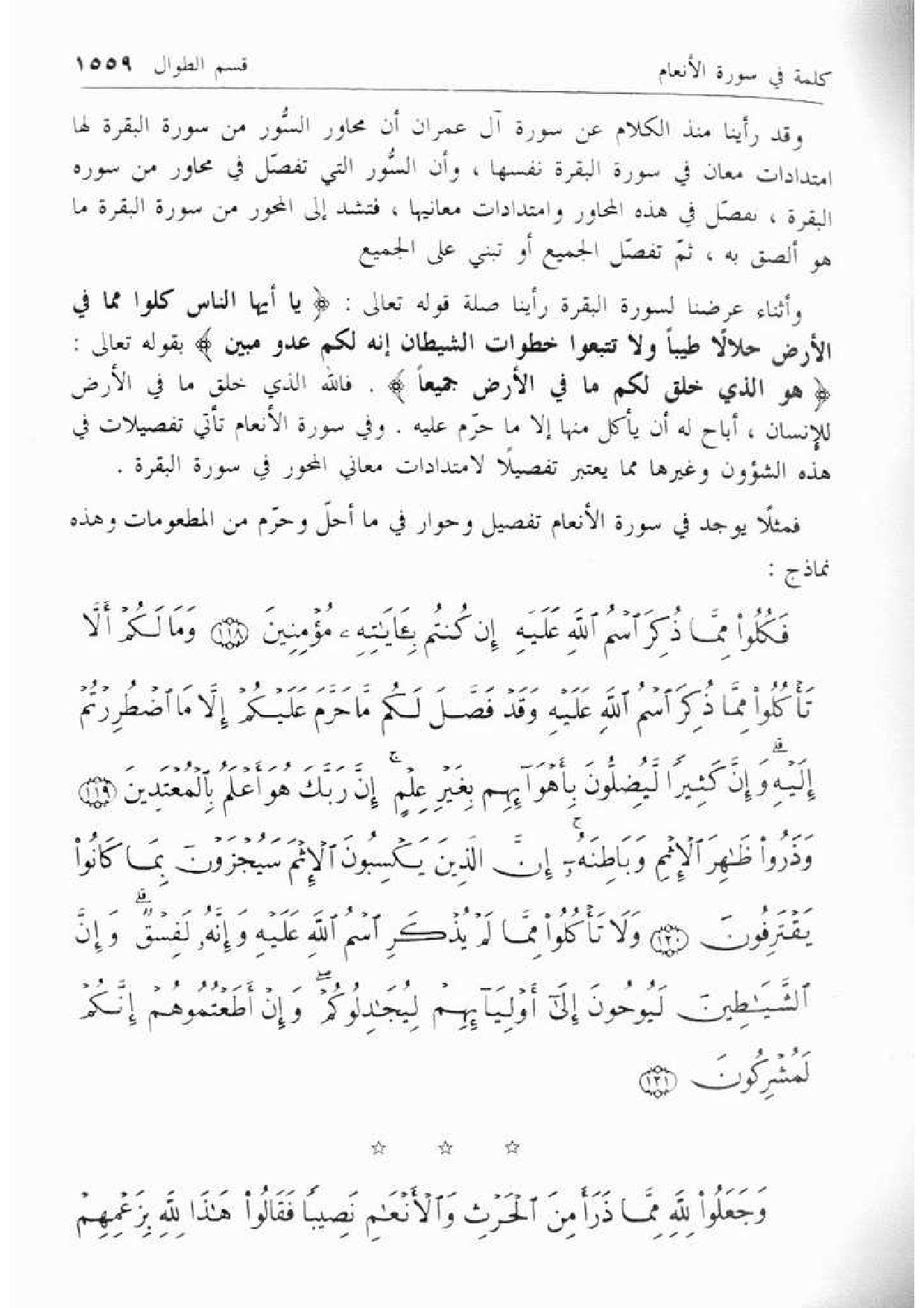 فمثلا يوجد في سورة الأنعام تفصيل وحوار في ما أحلّ وحرّم من المطعومات وهذه نماذج: