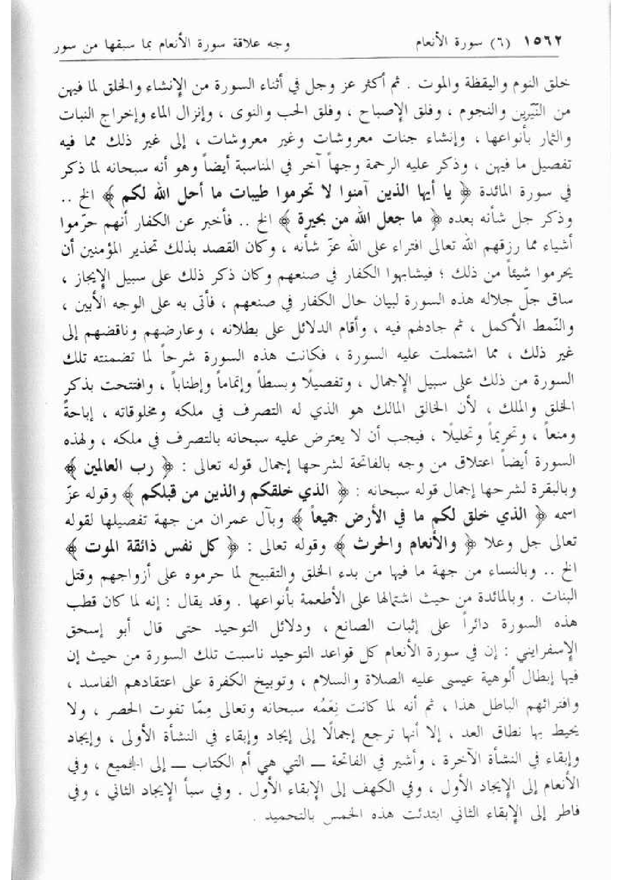 ومخلوقاته، إباحة ومنعا، وتحريما وتحليلا، فيجب أن لا يعترض عليه سبحانه بالتصرف في ملكه، ولهذه السورة أيضا اعتلاق من وجه بالفاتحة لشرحها إجمال قوله تعالى: رَبِّ الْعالَمِينَ وبالبقرة لشرحها إجمال قوله سبحانه: الَّذِي خَلَقَكُمْ وَالَّذِينَ مِنْ قَبْلِكُمْ وقوله عزّ اسمه الَّذِي خَلَقَ لَكُمْ ما فِي الْأَرْضِ جَمِيعاً وبآل عمران من جهة تفصيلها لقوله تعالى جل وعلا وَالْأَنْعامِ وَالْحَرْثِ وقوله تعالى: كُلُّ نَفْسٍ ذائِقَةُ الْمَوْتِ الخ .. وبالنساء من جهة ما فيها من بدء الخلق والتقبيح لما حرموه على أزواجهم وقتل البنات. وبالمائدة من حيث اشتمالها على الأطعمة بأنواعها. وقد يقال: إنه لما كان قطب هذه السورة دائرا على إثبات الصانع، ودلائل التوحيد حتى قال أبو إسحاق الأسفرايني: إن في سورة الأنعام كل قواعد التوحيد ناسبت تلك السورة من حيث إن فيها إبطال ألوهية عيسى عليه الصلاة والسلام، وتوبيخ الكفرة على اعتقادهم الفاسد، وافترائهم الباطل هذا، ثم أنه لما كانت نعمه سبحانه وتعالى ممّا تفوت الحصر، ولا يحيط بها نطاق العد، إلا أنها ترجع إجمالا إلى إيجاد وإبقاء في النشأة الأولى، وإيجاد وإبقاء في النشأة الآخرة، وأشير في الفاتحة- التي هي أم الكتاب- إلى الجميع، وفي الأنعام إلى الإيجاد الأول، وفي الكهف إلى الإبقاء الأول. وفي سبأ الإيجاد الثاني، وفي فاطر إلى الإبقاء الثاني ابتدئت هذه الخمس بالتحميد.