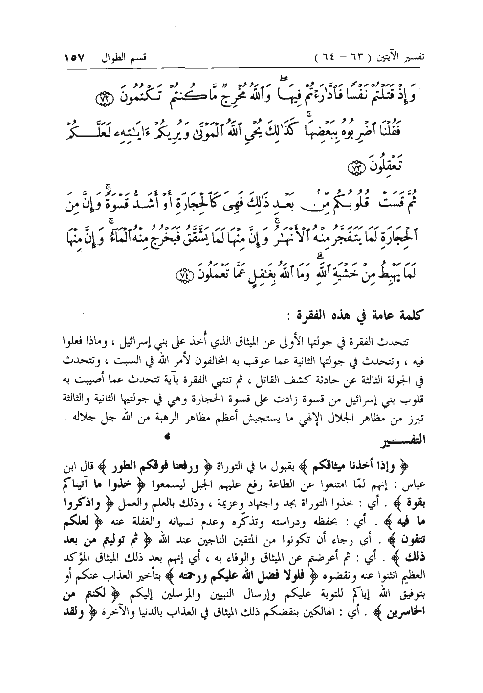 تتحدث الفقرة في جولتها الأولى عن الميثاق الذي أخذ على بني إسرائيل، وماذا فعلوا فيه، وتتحدث في جولتها الثانية عما عوقب به المخالفون لأمر الله في البست، وتتحدث في الجولة الثالثة عن حادثة كشف القاتل، ثم تنتهي الفقرة بآية تتحدث عما أصيبت به قلوب بني إسرائيل من قسوة زادت على قسوة الحجارة وهي في جولتيها الثانية والثالثة تبرز من مظاهر الجلال الإلهي ما يستجيش أعظم مظاهر الرهبة من الله جل جلاله.