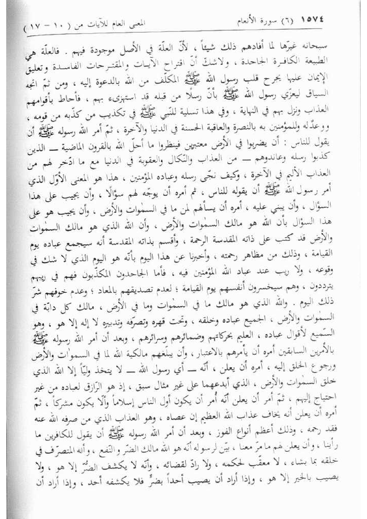 كذبوا رسله وعاندوهم- من العذاب والنّكال والعقوبة في الدنيا مع ما ادّخر لهم من العذاب الأليم في الآخرة، وكيف نجّى رسله وعباده المؤمنين، هذا هو المعنى الأوّل الذي أمر رسول الله صلّى الله عليه وسلّم أن يقوله للناس، ثم أمره أن يوجّه لهم سؤالا، وأن يجيب على هذا السؤال، وأن يبني عليه، أمره أن يسألهم لمن ما في السموات والأرض، وأن يجيب هو على هذا السؤال بأن الله هو مالك السموات والأرض، وأن الله الذي هو مالك السموات والأرض قد كتب على ذاته المقدسة الرحمة، وأقسم بذاته المقدسة أنه سيجمع عباده يوم القيامة، وذلك من مظاهر رحمته، وأخبرنا عن هذا اليوم بأنّه هو اليوم الذي لا شك في وقوعه، ولا ريب عند عباد الله المؤمنين فيه، فأما الجاحدون المكذّبون فهم في ريبهم يترددون، وهم سيخسرون أنفسهم يوم القيامة؛ لعدم تصديقهم بالمعاد؛ وعدم خوفهم شرّ ذلك اليوم. والله الذي هو مالك ما في السموات وما في الأرض، مالك كل دابّة في السموات والأرض، الجميع عباده وخلقه، وتحت قهره وتصرّفه وتدبيره لا إله إلا هو، وهو السّميع لأقوال عباده، العليم بحركاتهم وضمائرهم وسرائرهم، وبعد أن أمر الله رسوله صلّى الله عليه وسلّم بالأمرين السابقين أمره أن يأمرهم بالاعتبار، وأن يبلّغهم مالكية الله لما في السموات والأرض ورجوع الخلق إليه، أمره أن يعلن، أنّه- أي رسول الله- لا يتخذ وليّا إلا الله الذي خلق السموات والأرض، الذي أبدعهما على غير مثال سبق، إذ هو الرّازق لعباده من غير احتياج إليهم، ثمّ أمر أن يعلن أنّه أمر أن يكون أول الناس إسلاما وألّا يكون مشركا، ثمّ أمره أن يعلن أنه يخاف عذاب الله العظيم إن عصاه، وهو العذاب الذي من صرفه الله عنه فقد رحمه، وذلك أعظم أنواع الفوز، وبعد أن أمر الله رسوله صلّى الله عليه وسلّم أن يقول للكافرين ما رأينا، وأن يعلن لهم ما مرّ معنا، بيّن لرسوله أنّه هو الله مالك الضرّ والنّفع، وأنه المتصرّف في خلقه بما يشاء، لا معقّب لحكمه، ولا رادّ لقضائه، وأنّه لا يكشف الضّرّ إلا هو، ولا يصيب بالخير إلا هو، وإذا أراد أن يصيب أحدا بضرّ فلا يكشفه أحد، وإذا أراد أن