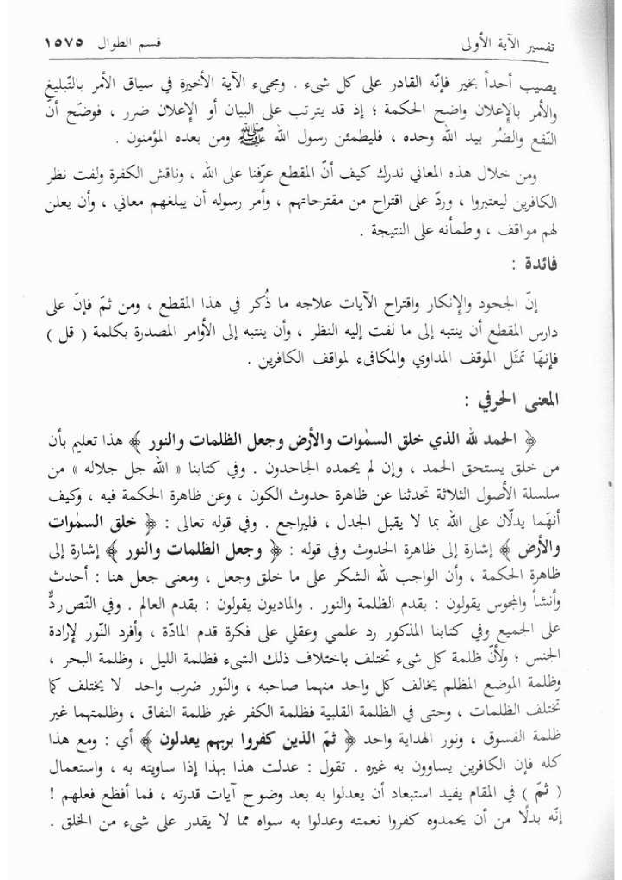 الْحَمْدُ لِلَّهِ الَّذِي خَلَقَ السَّماواتِ وَالْأَرْضَ وَجَعَلَ الظُّلُماتِ وَالنُّورَ هذا تعليم بأن من خلق يستحق الحمد، وإن لم يحمده الجاحدون. وفي كتابنا «الله جل جلاله» من سلسلة الأصول الثلاثة تحدثنا عن ظاهرة حدوث الكون، وعن ظاهرة الحكمة فيه، وكيف أنّهما يدلّان على الله بما لا يقبل الجدل، فليراجع. وفي قوله تعالى: خَلَقَ السَّماواتِ وَالْأَرْضَ إشارة إلى ظاهرة الحدوث وفي قوله: وَجَعَلَ الظُّلُماتِ وَالنُّورَ إشارة إلى ظاهرة الحكمة، وأن الواجب لله الشكر على ما خلق وجعل، ومعنى جعل هنا: أحدث وأنشأ والمجوس يقولون: بقدم الظلمة والنور. والماديون يقولون: بقدم العالم. وفي النّص ردّ على الجميع وفي كتابنا المذكور رد علمي وعقلي على فكرة قدم المادّة، وأفرد النّور لإرادة الجنس؛ ولأنّ ظلمة كل شئ تختلف باختلاف ذلك الشئ فظلمة الليل، وظلمة البحر، وظلمة الموضع المظلم يخالف كل واحد منهما صاحبه، والنّور ضرب واحد لا يختلف كما تختلف الظلمات، وحتى في الظلمة القلبية فظلمة الكفر غير ظلمة النفاق، وظلمتهما غير ظلمة الفسوق، ونور الهداية واحد ثُمَّ الَّذِينَ كَفَرُوا بِرَبِّهِمْ يَعْدِلُونَ أي: ومع هذا كله فإن الكافرين يساوون به غيره. تقول: عدلت هذا بهذا إذا ساويته به، واستعمال (ثمّ) في المقام يفيد استبعاد أن يعدلوا به بعد وضوح آيات قدرته، فما أفظع فعلهم! إنّه بدلا من أن يحمدوه كفروا نعمته وعدلوا به سواه مما لا يقدر على شئ من الخلق.