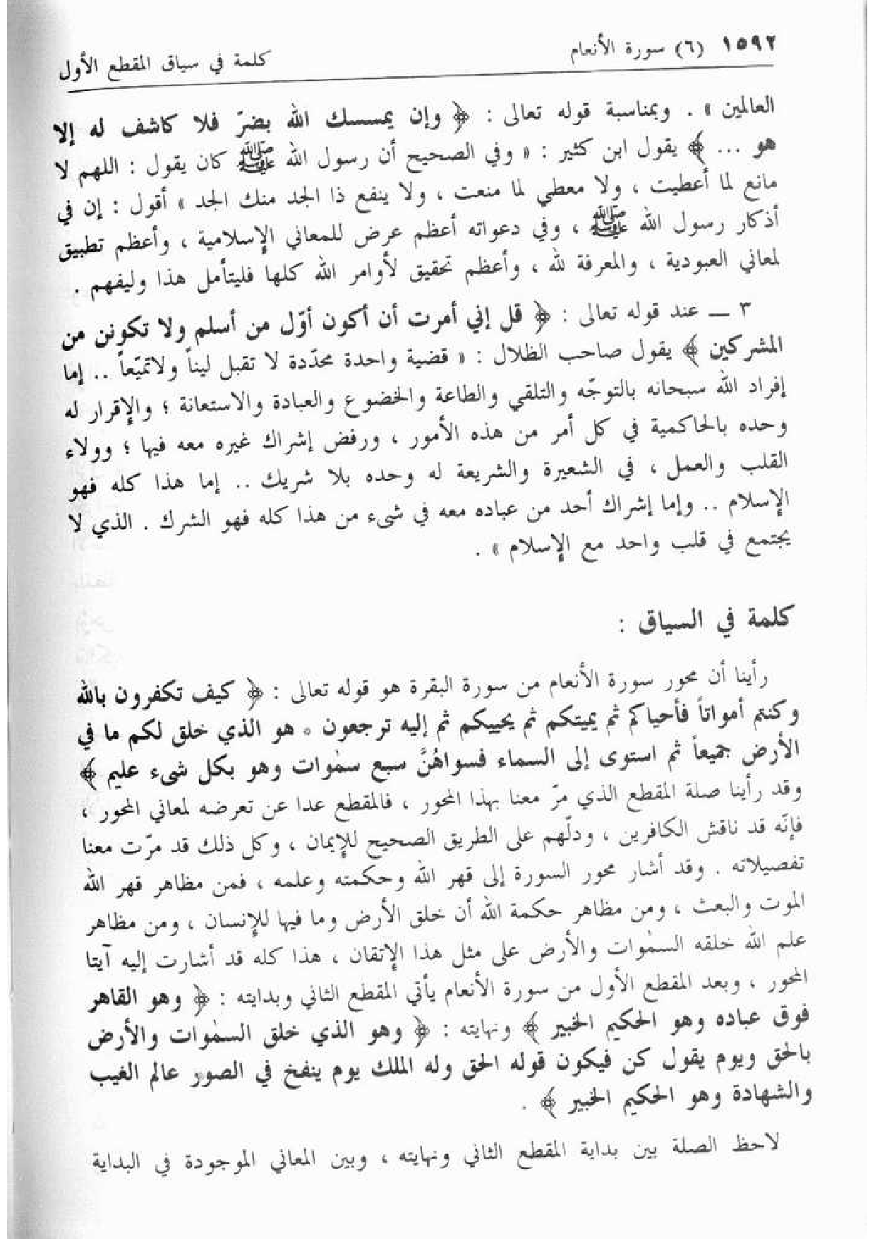 العالمين». وبمناسبة قوله تعالى: وَإِنْ يَمْسَسْكَ اللَّهُ بِضُرٍّ فَلا كاشِفَ لَهُ إِلَّا هُوَ ... يقول ابن كثير: «وفي الصحيح أن رسول الله صلّى الله عليه وسلّم كان يقول: اللهم لا مانع لما أعطيت، ولا معطي لما منعت، ولا ينفع ذا الجد منك الجد» أقول: إن في أذكار رسول الله صلّى الله عليه وسلّم، وفي دعواته أعظم عرض للمعاني الإسلامية، وأعظم تطبيق لمعاني العبودية، والمعرفة لله، وأعظم تحقيق لأوامر الله كلها فليتأمل هذا وليفهم.