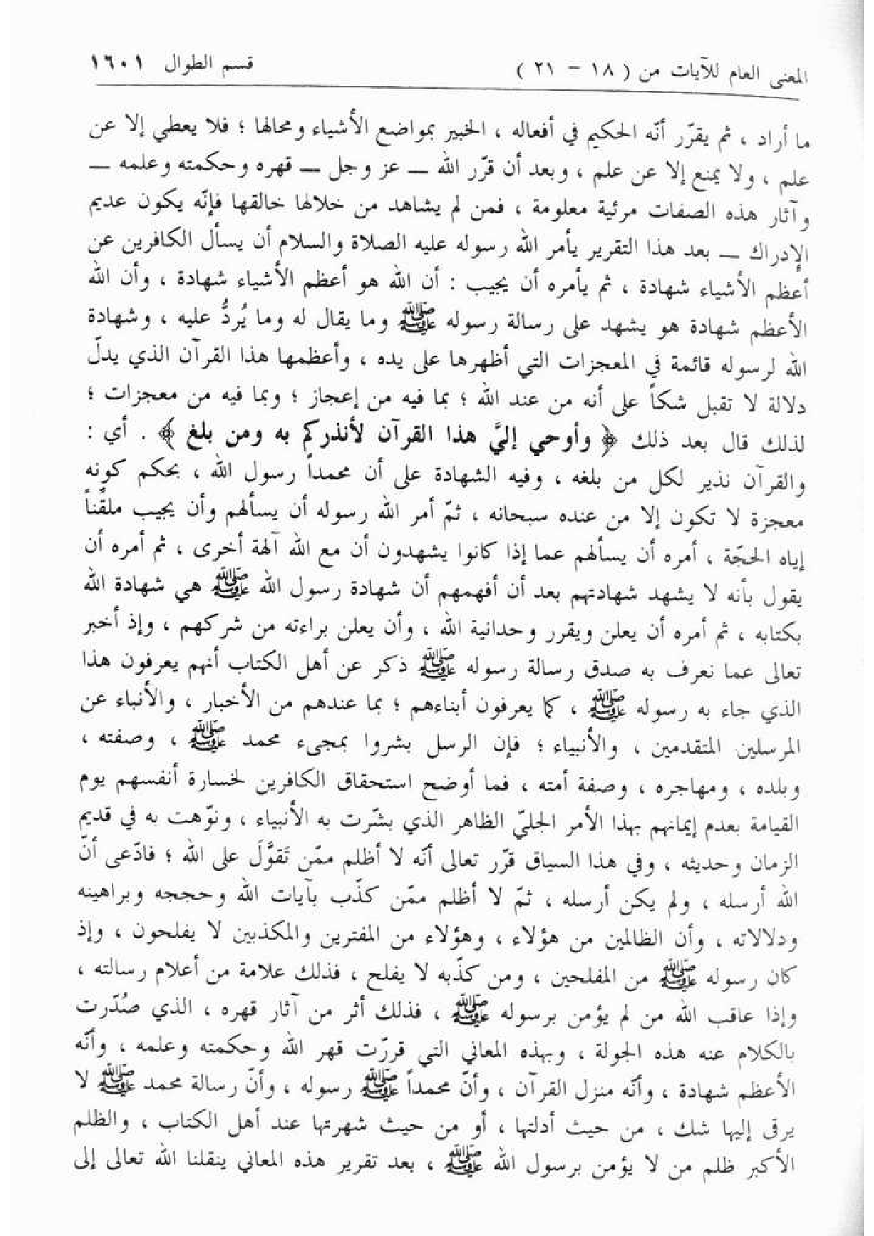 والقرآن نذير لكل من بلغه، وفيه الشهادة على أن محمدا رسول الله، بحكم كونه معجزة لا تكون إلا من عنده سبحانه، ثمّ أمر الله رسوله أن يسألهم وأن يجيب ملقّنا إياه الحجّة، أمره أن يسألهم عما إذا كانوا يشهدون أن مع الله آلهة أخرى، ثم أمره أن يقول بأنه لا يشهد شهادتهم بعد أن أفهمهم أن شهادة رسول الله صلّى الله عليه وسلّم هي شهادة الله بكتابه، ثم أمره أن يعلن ويقرر وحدانية الله، وأن يعلن براءته من شركهم، وإذ أخبر تعالى عما نعرف به صدق رسالة رسوله صلّى الله عليه وسلّم ذكر عن
