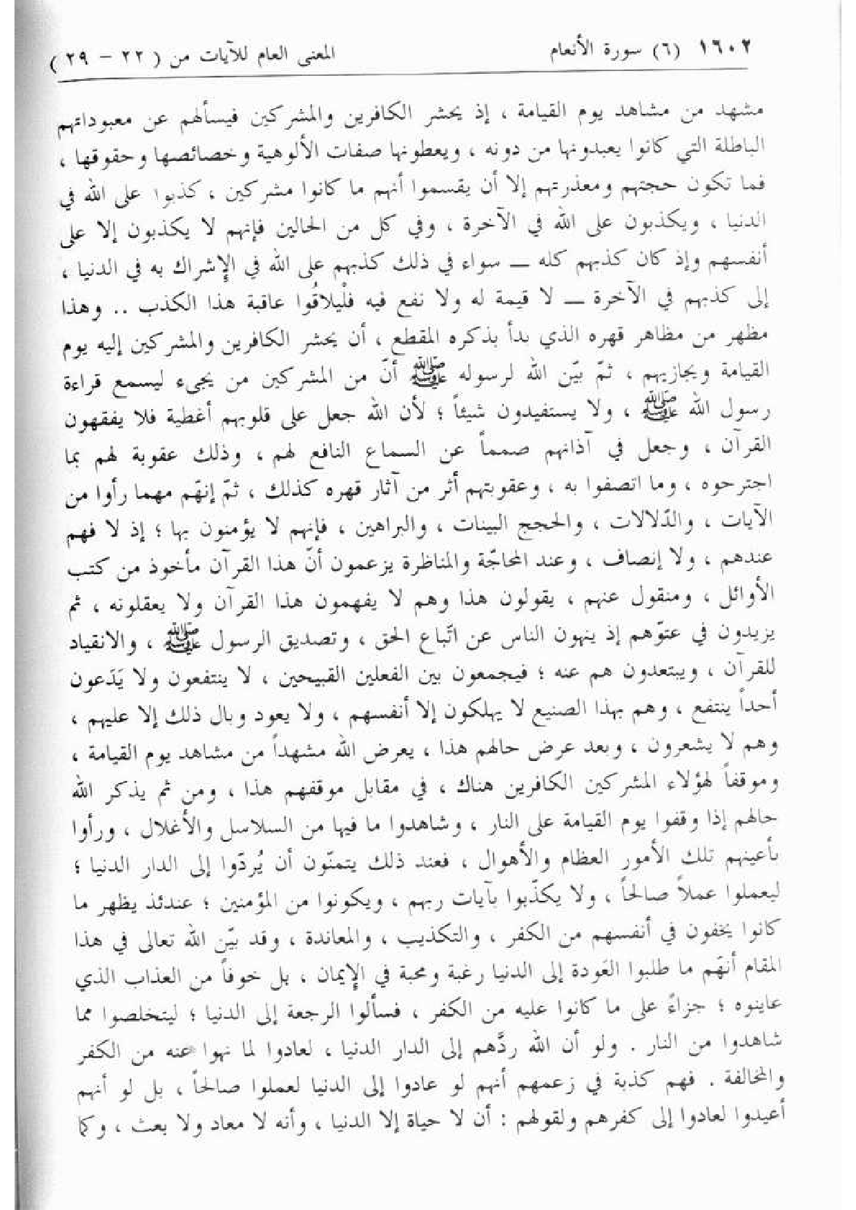 مشهد من مشاهد يوم القيامة، إذ يحشر الكافرين والمشركين فيسألهم عن معبوداتهم الباطلة التي كانوا يعبدونها من دونه، ويعطونها صفات الألوهية وخصائصها وحقوقها، فما تكون حجتهم ومعذرتهم إلا أن يقسموا أنهم ما كانوا مشركين، كذبوا على الله في الدنيا، ويكذبون على الله في الآخرة، وفي كل من الحالين فإنهم لا يكذبون إلا على أنفسهم وإذ كان كذبهم كله- سواء في ذلك كذبهم على الله في الإشراك به في الدنيا، إلى كذبهم في الآخرة- لا قيمة له ولا نفع فيه فليلاقوا عاقبة هذا الكذب .. وهذا مظهر من مظاهر قهره الذي بدأ بذكره المقطع، أن يحشر الكافرين والمشركين إليه يوم القيامة ويجازيهم، ثمّ بيّن الله لرسوله صلّى الله عليه وسلّم أنّ من المشركين من يجئ ليسمع قراءة رسول الله صلّى الله عليه وسلّم، ولا يستفيدون شيئا؛ لأن الله جعل على قلوبهم أغطية فلا يفقهون القرآن، وجعل في آذانهم صمما عن السماع النافع لهم، وذلك عقوبة لهم بما اجترحوه، وما اتصفوا به، وعقوبتهم أثر من آثار قهره كذلك، ثمّ إنّهم مهما رأوا من الآيات، والدّلالات، والحجج البينات، والبراهين، فإنهم لا يؤمنون بها؛ إذ لا فهم عندهم، ولا إنصاف، وعند المحاجّة والمناظرة يزعمون أنّ هذا القرآن مأخوذ من كتب الأوائل، ومنقول عنهم، يقولون هذا وهم لا يفهمون هذا القرآن ولا يعقلونه، ثم يزيدون في عتوّهم إذ ينهون الناس عن اتّباع الحق، وتصديق الرسول صلّى الله عليه وسلّم، والانقياد للقرآن، ويبتعدون هم عنه؛ فيجمعون بين الفعلين القبيحين، لا ينتفعون ولا يدعون أحدا ينتفع، وهم بهذا الصنيع لا يهلكون إلا أنفسهم، ولا يعود وبال ذلك إلا عليهم، وهم لا يشعرون، وبعد عرض حالهم هذا، يعرض الله مشهدا من مشاهد يوم القيامة، وموقفا لهؤلاء المشركين الكافرين هناك، في مقابل موقفهم هذا، ومن ثم يذكر الله حالهم إذا وقفوا يوم القيامة على النار، وشاهدوا ما فيها من السلاسل والأغلال، ورأوا بأعينهم تلك الأمور العظام والأهوال، فعند ذلك يتمنّون أن يردّوا إلى الدار الدنيا؛ ليعملوا عملا صالحا، ولا يكذّبوا بآيات ربهم، ويكونوا من المؤمنين؛ عندئذ يظهر ما كانوا يخفون في أنفسهم من الكفر، والتكذيب، والمعاندة، وقد بيّن الله تعالى في هذا المقام أنهّم ما طلبوا العودة إلى الدنيا رغبة ومحبة في الإيمان، بل خوفا من العذاب الذي عاينوه؛ جزاء على ما كانوا عليه من الكفر، فسألوا الرجعة إلى الدنيا؛ ليتخلصوا مما شاهدوا من النار. ولو أن الله ردّهم إلى الدار الدنيا، لعادوا لما نهوا عنه من الكفر والمخالفة. فهم كذبة في زعمهم أنهم لو عادوا إلى الدنيا لعملوا صالحا، بل لو أنهم أعيدوا لعادوا إلى كفرهم ولقولهم: أن لا حياة إلا الدنيا، وأنه لا معاد ولا بعث، وكما