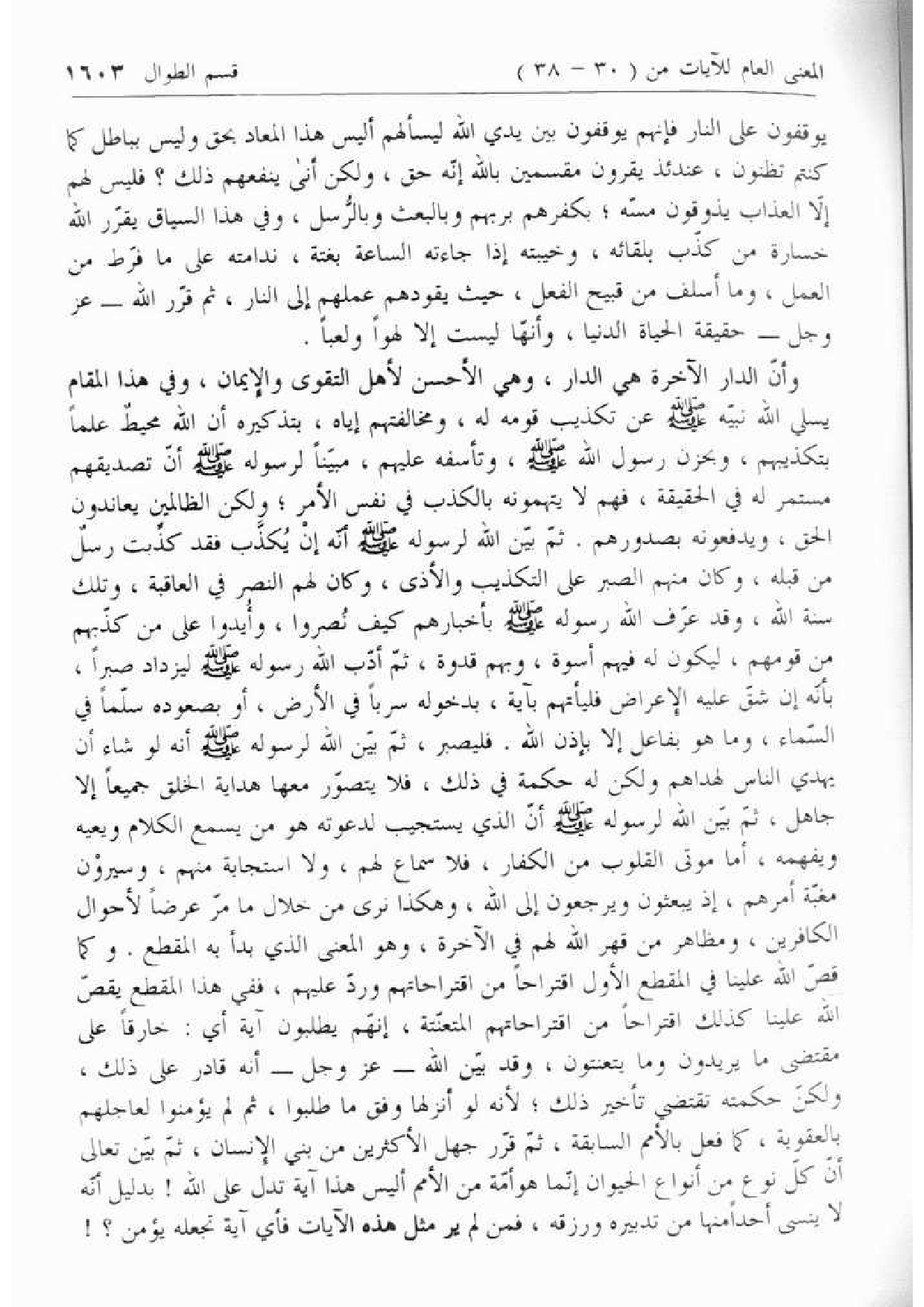 وأنّ الدار الآخرة هي الدار، وهي الأحسن لأهل التقوى والإيمان، وفي هذا المقام يسلي الله نبيّه صلّى الله عليه وسلّم عن تكذيب قومه له، ومخالفتهم إياه، بتذكيره أن الله محيط علما بتكذيبهم، وبحزن رسول الله صلّى الله عليه وسلّم، وتأسفه عليهم، مبيّنا لرسوله صلّى الله عليه وسلّم أنّ تصديقهم مستمر له في الحقيقة، فهم لا يتهمونه بالكذب في نفس الأمر؛ ولكن الظالمين يعاندون الحق، ويدفعونه بصدورهم. ثمّ بيّن الله لرسوله صلّى الله عليه وسلّم أنّه إن يكذّب فقد كذّبت رسل من قبله، وكان منهم الصبر على التكذيب والأذى، وكان لهم النصر في العاقبة، وتلك سنة الله، وقد عرّف الله رسوله صلّى الله عليه وسلّم بأخبارهم كيف نصروا، وأيدوا على من كذّبهم من قومهم، ليكون له فيهم أسوة، وبهم قدوة، ثمّ أدّب الله رسوله صلّى الله عليه وسلّم ليزداد صبرا، بأنّه إن شقّ عليه الإعراض فليأتهم بآية، بدخوله سربا في الأرض، أو بصعوده سلّما في السّماء، وما هو بفاعل إلا بإذن الله. فليصبر، ثمّ بيّن الله لرسوله صلّى الله عليه وسلّم أنه لو شاء أن يهدي الناس لهداهم ولكن له حكمة في ذلك، فلا يتصوّر معها هداية الخلق جميعا إلا جاهل، ثمّ بيّن الله لرسوله صلّى الله عليه وسلّم أنّ الذي يستجيب لدعوته هو من يسمع الكلام ويعيه ويفهمه، أما موتى القلوب من الكفار، فلا سماع لهم، ولا استجابة منهم، وسيرون مغبّة أمرهم، إذ يبعثون ويرجعون إلى الله، وهكذا نرى من خلال ما مرّ عرضا لأحوال الكافرين، ومظاهر من قهر الله لهم في الآخرة، وهو المعنى الذي بدأ به المقطع. وكما قصّ الله علينا في المقطع الأول اقتراحا من اقتراحاتهم وردّ عليهم، ففي هذا المقطع يقصّ الله علينا كذلك اقتراحا من اقتراحاتهم المتعنّتة، إنّهم يطلبون آية أي: خارقا على مقتضى ما يريدون وما يتعنتون، وقد بيّن الله- عزّ وجل- أنه قادر على ذلك، ولكنّ حكمته تقتضي تأخير ذلك؛ لأنه لو أنزلها وفق ما طلبوا، ثم لم يؤمنوا لعاجلهم بالعقوبة، كما فعل بالأمم السابقة، ثمّ قرّر جهل الأكثرين من بني الإنسان، ثمّ بيّن تعالى أنّ كلّ نوع من أنواع الحيوان إنّما هو أمّة من الأمم أليس هذا آية تدل على الله! بدليل أنّه لا ينسى أحدا منها من تدبيره ورزقه، فمن لم ير مثل هذه الآيات فأي آية تجعله يؤمن؟!