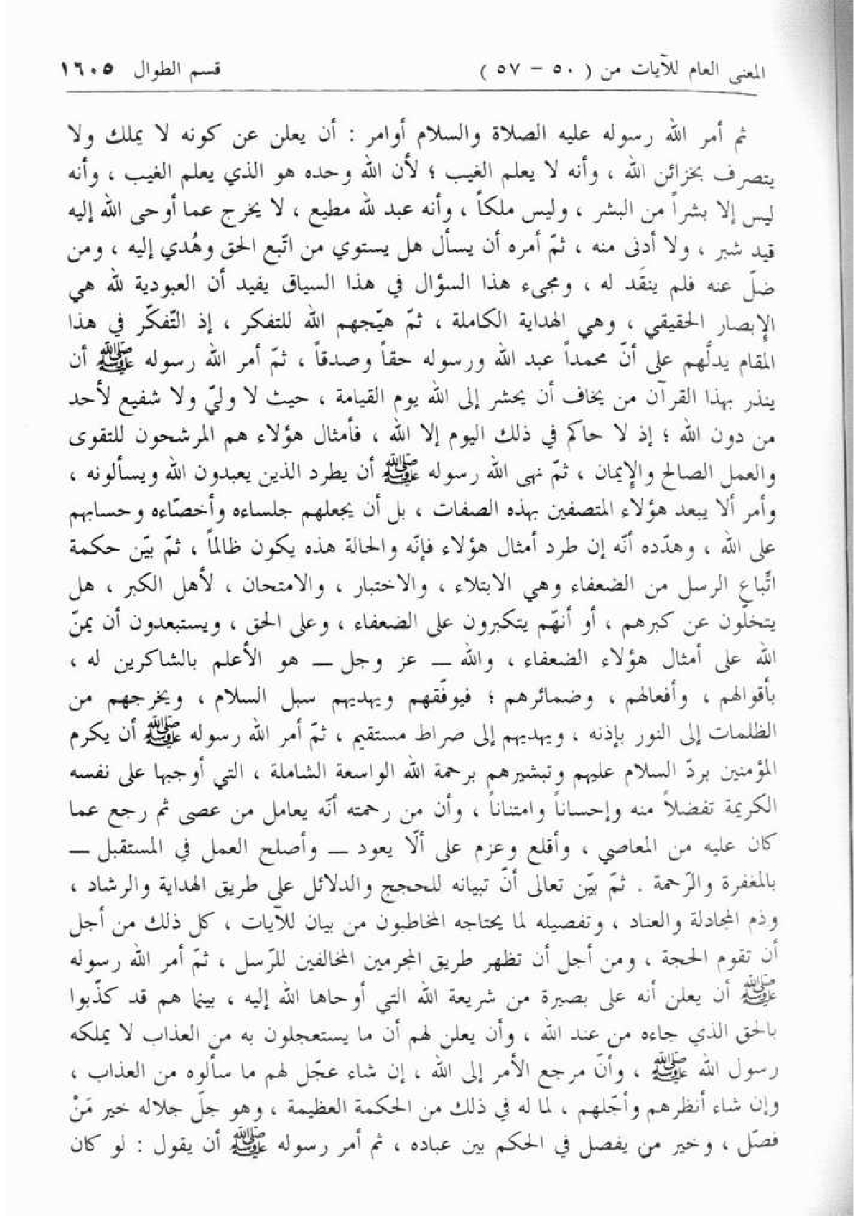 ثم أمر الله رسوله عليه الصلاة والسلام أوامر: أن يعلن عن كونه لا يملك ولا يتصرف بخزائن الله، وأنه لا يعلم الغيب؛ لأن الله وحده هو الذي يعلم الغيب، وأنه ليس إلا بشرا من البشر، وليس ملكا، وأنه عبد لله مطيع، لا يخرج عما أوحى الله إليه قيد شبر، ولا أدنى منه، ثمّ أمره أن يسأل هل يستوي من اتّبع الحق وهدي إليه، ومن ضلّ عنه فلم ينقد له، ومجئ هذا السؤال في هذا السياق يفيد أن العبودية لله هي الإبصار الحقيقي، وهي الهداية الكاملة، ثمّ هيّجهم الله للتفكر، إذ التّفكّر في هذا المقام يدلّهم على أنّ محمدا عبد الله ورسوله حقا وصدقا، ثمّ أمر الله رسوله صلّى الله عليه وسلّم أن ينذر بهذا القرآن من يخاف أن يحشر إلى الله يوم القيامة، حيث لا وليّ ولا شفيع لأحد من دون الله؛ إذ لا حاكم في ذلك اليوم إلا الله، فأمثال هؤلاء هم المرشحون للتقوى والعمل الصالح والإيمان، ثمّ نهى الله رسوله صلّى الله عليه وسلّم أن يطرد الذين يعبدون الله ويسألونه، وأمر ألا يبعد هؤلاء المتصفين بهذه الصفات، بل أن يجعلهم جلساءه وأخصّاءه وحسابهم على الله، وهدّده أنّه إن طرد أمثال هؤلاء فإنّه والحالة هذه يكون ظالما، ثمّ بيّن حكمة اتّباع الرسل من الضعفاء وهي الابتلاء، والاختبار، والامتحان، لأهل الكبر، هل يتخلّون عن كبرهم، أو إنهّم يتكبرون على الضعفاء، وعلى الحق، ويستبعدون أن يمنّ الله على أمثال هؤلاء الضعفاء، والله- عزّ وجل- هو الأعلم بالشاكرين له، بأقوالهم، وأفعالهم، وضمائرهم؛ فيوفّقهم ويهديهم سبل السلام، ويخرجهم من الظلمات إلى النور بإذنه، ويهديهم إلى صراط مستقيم، ثمّ أمر الله رسوله صلّى الله عليه وسلّم أن يكرم المؤمنين بردّ السلام عليهم وتبشيرهم برحمة الله الواسعة الشاملة، التي أوجبها على نفسه الكريمة تفضلا منه وإحسانا وامتنانا، وأن من رحمته أنّه يعامل من عصى ثم رجع عما كان عليه من المعاصي، وأقلع وعزم على ألّا يعود- وأصلح العمل في المستقبل- بالمغفرة والرّحمة. ثمّ بيّن تعالى أنّ تبيانه للحجج والدلائل على طريق الهداية والرشاد، وذم المجادلة والعناد، وتفصيله لما يحتاجه المخاطبون من بيان للآيات، كل ذلك من أجل أن تقوم الحجة، ومن أجل أن تظهر طريق المجرمين المخالفين للرّسل، ثمّ أمر الله رسوله صلّى الله عليه وسلّم أن يعلن أنه على بصيرة من شريعة الله التي أوحاها الله إليه، بينما هم قد كذّبوا بالحق الذي جاءه من عند الله، وأن يعلن لهم أن ما يستعجلون به من العذاب لا يملكه رسول الله صلّى الله عليه وسلّم، وأنّ مرجع الأمر إلى الله، إن شاء عجّل لهم ما سألوه من العذاب، وإن شاء أنظرهم وأجّلهم، لما له في ذلك من الحكمة العظيمة، وهو جلّ جلاله خير من فصّل، وخير من يفصل في الحكم بين عباده، ثم أمر رسوله صلّى الله عليه وسلّم أن يقول: لو كان