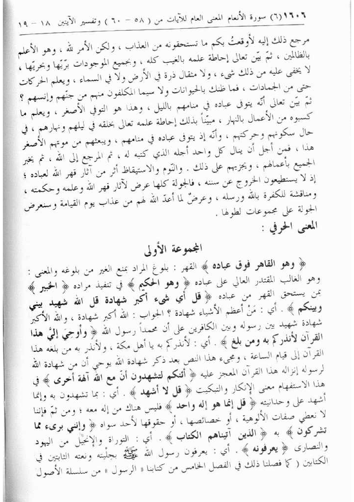 ثمّ بيّن تعالى أنّه يتوفى عباده في منامهم بالليل، وهذا هو التوفي الأصغر، ويعلم ما كسبوه من الأعمال بالنهار، مبيّنا بذلك إحاطة علمه تعالى بخلقه في ليلهم ونهارهم، في حال سكونهم وحركتهم، وأنّه إذ يتوفى عباده في منامهم، ويبعثهم من موتهم الأصغر هذا، فمن أجل أن ينال كل واحد أجله الذي كتبه له، ثم المرجع إلى الله، ثم يخبر الجميع بأعمالهم، ويجزيهم على ذلك. والنّوم والاستيقاظ أثر من آثار قهر الله لعباده؛ إذ لا يستطيعون الخروج عن سننه، فالجولة كلها عرض لآثار قهر الله وعلمه وحكمته، ومناقشة للكفرة بالله ورسله، وعرض لما أعدّ الله لهم من عذاب يوم القيامة وسنعرض الجولة على مجموعات لطولها.