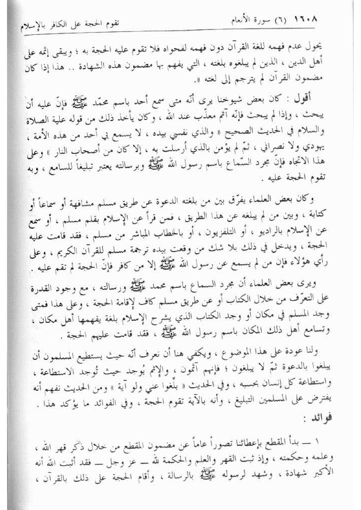 يحول عدم فهمه للغة القرآن دون فهمه لفحواه فلا تقوم عليه الحجة به؛ ويبقى إثمه على أهل الدين، الذين لم يبلغوه بلغته، التي يفهم بها مضمون هذه الشهادة .. هذا إذا كان مضمون القرآن لم يترجم إلى لغته».