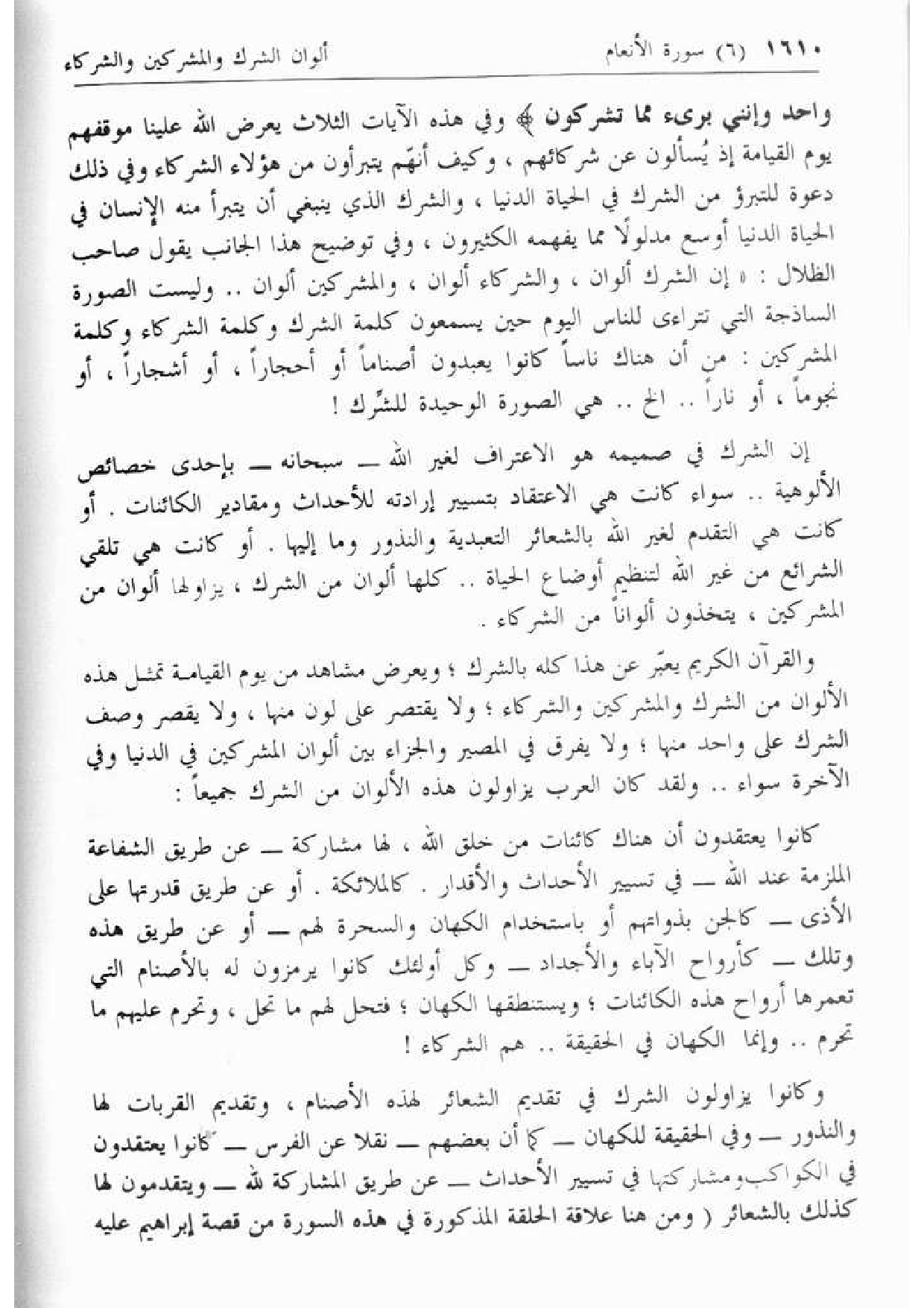 إن الشرك في صميمه هو الاعتراف لغير الله- سبحانه- بإحدى خصائص الألوهية .. سواء كانت هي الاعتقاد بتسيير إرادته للأحداث ومقادير الكائنات. أو كانت هي التقدم لغير الله بالشعائر التعبدية والنذور وما إليها. أو كانت هي تلقي الشرائع من غير الله لتنظيم أوضاع الحياة .. كلها ألوان من الشرك، يزاولها ألوان من المشركين، يتخذون ألوانا من الشركاء.
