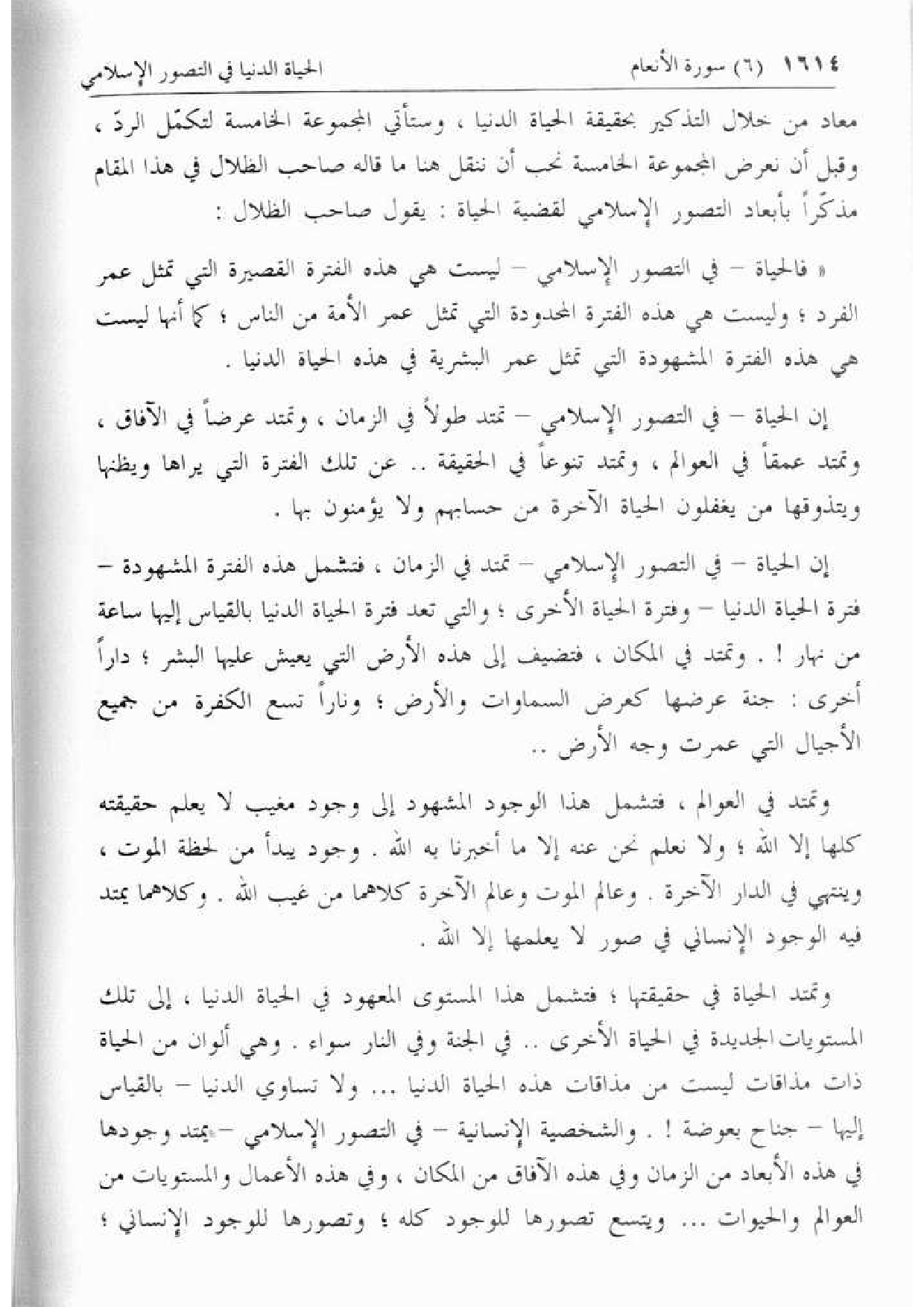 «فالحياة- في التصور الإسلامي- ليست هي هذه الفترة القصيرة التي تمثل عمر الفرد؛ وليست هي هذه الفترة المحدودة التي تمثل عمر الأمة من الناس؛ كما أنها ليست هي هذه الفترة المشهودة التي تمثل عمر البشرية في هذه الحياة الدنيا.