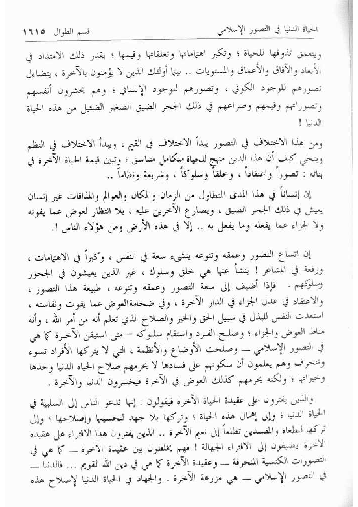 إن اتساع التصور وعمقه وتنوعه ينشئ سعة في النفس، وكبرا في الاهتمامات، ورفعة في المشاعر! ينشأ عنها هي خلق وسلوك، غير الذين يعيشون في الجحور وسلوكهم. فإذا أضيف إلى سعة التصور وعمقه وتنوعه، طبيعة هذا التصور، والاعتقاد في عدل الجزاء في الدار الآخرة، وفي ضخامة العوض عما يفوت ونفاسته، استعدت النفس للبذل في سبيل الحق والخير والصلاح الذي تعلم أنه من أمر الله، وأنه مناط العوض والجزاء؛ وصلح الفرد واستقام سلوكه- متى استيقن الآخرة كما هي في التصور الإسلامي- وصلحت الأوضاع والأنظمة، التي لا يتركها الأفراد تسوء وتنحرف وهم يعلمون أن سكوتهم على فسادها لا يحرمهم صلاح الحياة الدنيا وحدها وخيراتها؛ ولكنه يحرمهم كذلك العوض في الآخرة فيخسرون الدنيا والآخرة.