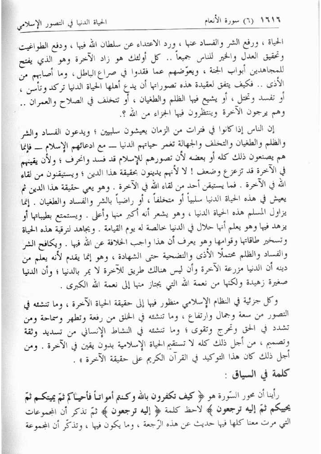 وكل جزئية في النظام الإسلامي منظور فيها إلى حقيقة الحياة الآخرة، وما تنشئه في التصور من سعة وجمال وارتفاع، وما تنشئه في الخلق من رفعة وتطهر وسماحة ومن تشدد في الحق وتحرج وتقوى؛ وما تنشئه في النشاط الإنساني من تسديد وثقة وتصميم، من أجل ذلك كله لا تستقيم الحياة الإسلامية بدون يقين في الآخرة. ومن أجل ذلك كان هذا التوكيد في القرآن الكريم على حقيقة الآخرة».