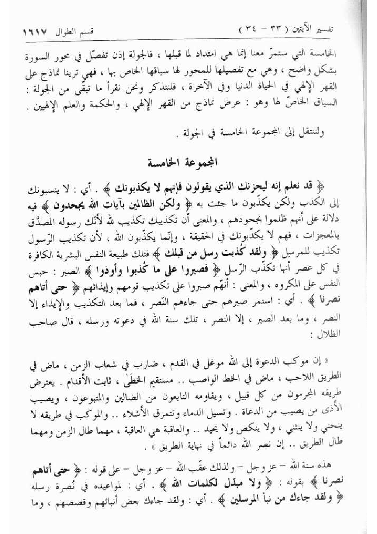 وَلَقَدْ كُذِّبَتْ رُسُلٌ مِنْ قَبْلِكَ فتلك طبيعة النفس البشرية الكافرة في كل عصر أنها تكذّب الرّسل فَصَبَرُوا عَلى ما كُذِّبُوا وَأُوذُوا الصبر: حبس النفس على المكروه، والمعنى: أنّهم صبروا على تكذيب قومهم وإيذائهم حَتَّى أَتاهُمْ نَصْرُنا. أي: استمر صبرهم حتى جاءهم النّصر، فما بعد التكذيب والإيذاء إلا النصر، وما بعد الصبر، إلا النصر، تلك سنة الله في دعوته ورسله، قال صاحب الظلال: