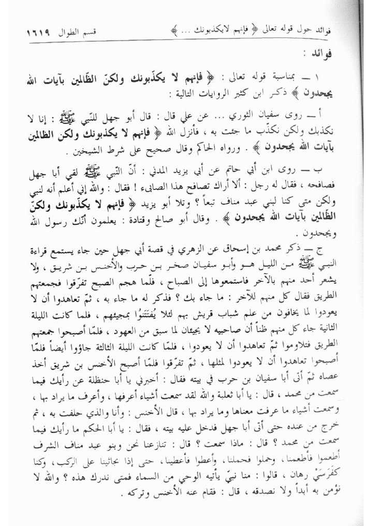1 - بمناسبة قوله تعالى: فَإِنَّهُمْ لا يُكَذِّبُونَكَ وَلكِنَّ الظَّالِمِينَ بِآياتِ اللَّهِ يَجْحَدُونَ ذكر ابن كثير الروايات التالية: