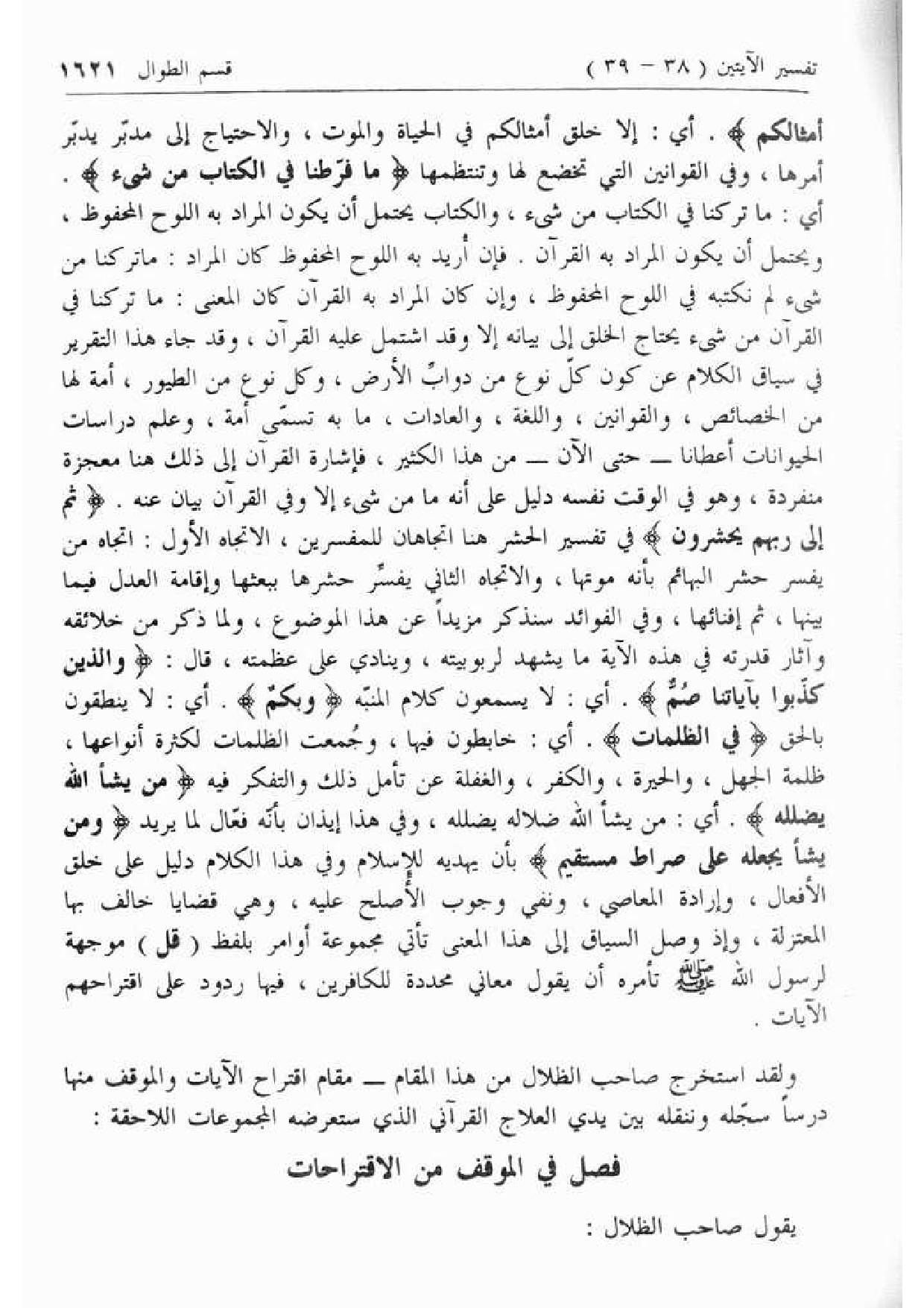 أي: ما تركنا في الكتاب من شئ، والكتاب يحتمل أن يكون المراد به اللوح المحفوظ، ويحتمل أن يكون المراد به القرآن. فإن أريد به اللوح المحفوظ كان المراد: ما تركنا من شئ لم نكتبه في اللوح المحفوظ، وإن كان المراد به القرآن كان المعنى: ما تركنا في القرآن من شئ يحتاج الخلق إلى بيانه إلا وقد اشتمل عليه القرآن، وقد جاء هذا التقرير في سياق الكلام عن كون كلّ نوع من دوابّ الأرض، وكل نوع من الطيور، أمة لها من الخصائص، والقوانين، واللغة، والعادات، ما به تسمّى أمة، وعلم دراسات الحيوانات أعطانا- حتى الآن- من هذا الكثير، فإشارة القرآن إلى ذلك هنا معجزة منفردة، وهو في الوقت نفسه دليل على أنه ما من شئ إلا وفي القرآن بيان عنه. ثُمَّ إِلى رَبِّهِمْ يُحْشَرُونَ في تفسير الحشر هنا اتجاهان للمفسرين، الاتجاه الأول: اتجاه من يفسر حشر البهائم بأنه موتها، والاتجاه الثاني يفسّر حشرها ببعثها وإقامة العدل فيما بينها، ثم إفنائها، وفي الفوائد سنذكر مزيدا عن هذا الموضوع، ولما ذكر من خلائقه وآثار قدرته في هذه الآية ما يشهد لربوبيته، وينادي على عظمته،
