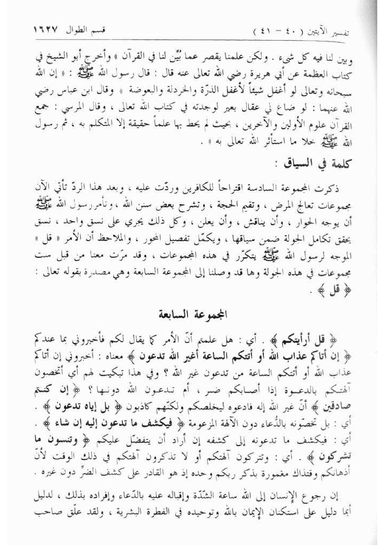 ذكرت المجموعة السادسة اقتراحا للكافرين وردّت عليه، وبعد هذا الردّ تأتي الآن مجموعات تعالج المرض، وتقيم الحجة، وتشرح بعض سنن الله، وتأمر رسول الله صلّى الله عليه وسلّم أن يوجه الحوار، وأن يناقش، وأن يعلن، وكل ذلك يجري على نسق واحد، نسق يحقق تكامل الجولة ضمن سياقها، ويكمّل تفصيل المحور، والملاحظ أن الأمر «قل» الموجه لرسول الله صلّى الله عليه وسلّم يتكرّر في هذه المجموعات، وقد مرّت معنا من قبل ست مجموعات في هذه الجولة وها قد وصلنا إلى المجموعة السابعة وهي مصدرة بقوله تعالى:
