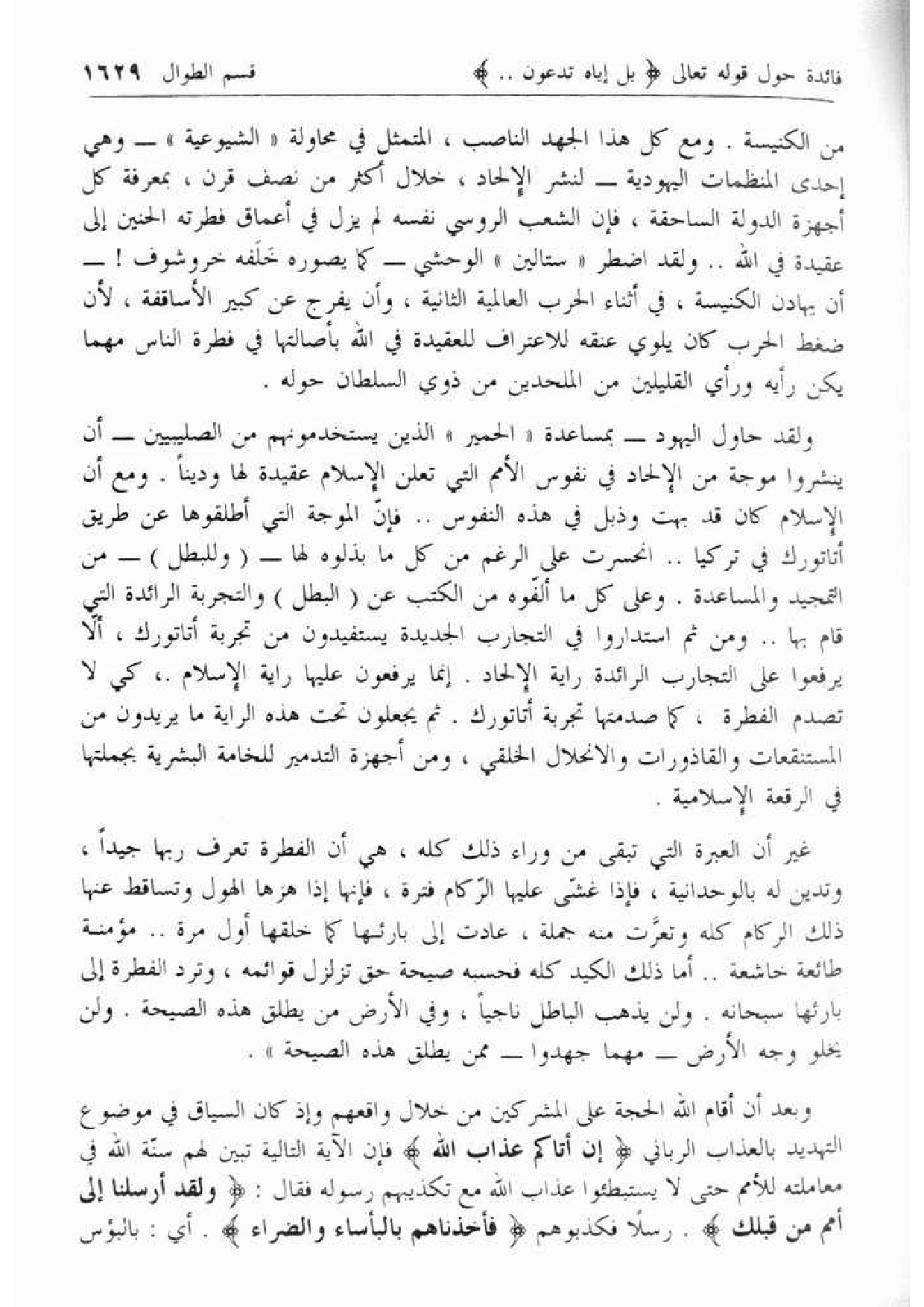 ولقد حاول اليهود- بمساعدة «الحمير» الذين يستخدمونهم من الصليبيين- أن ينشروا موجة من الإلحاد في نفوس الأمم التي تعلن الإسلام عقيدة لها ودينا. ومع أن الإسلام كان قد بهت وذبل في هذه النفوس .. فإنّ الموجة التي أطلقوها عن طريق أتاتورك في تركيا .. انحسرت على الرغم من كل ما بذلوه لها- (وللبطل) - من التمجيد والمساعدة. وعلى كل ما ألّفوه من الكتب عن (البطل) والتجربة الرائدة التي قام بها .. ومن ثم استداروا في التجارب الجديدة يستفيدون من تجربة أتاتورك، ألّا يرفعوا على التجارب الرائدة راية الإلحاد. إنما يرفعون عليها راية الإسلام.، كيلا تصدم الفطرة، كما صدمتها تجربة أتاتورك. ثم يجعلون تحت هذه الراية ما يريدون من المستنقعات والقاذورات والانحلال الخلقي، ومن أجهزة التدمير للخامة البشرية بجملتها في الرقعة الإسلامية.