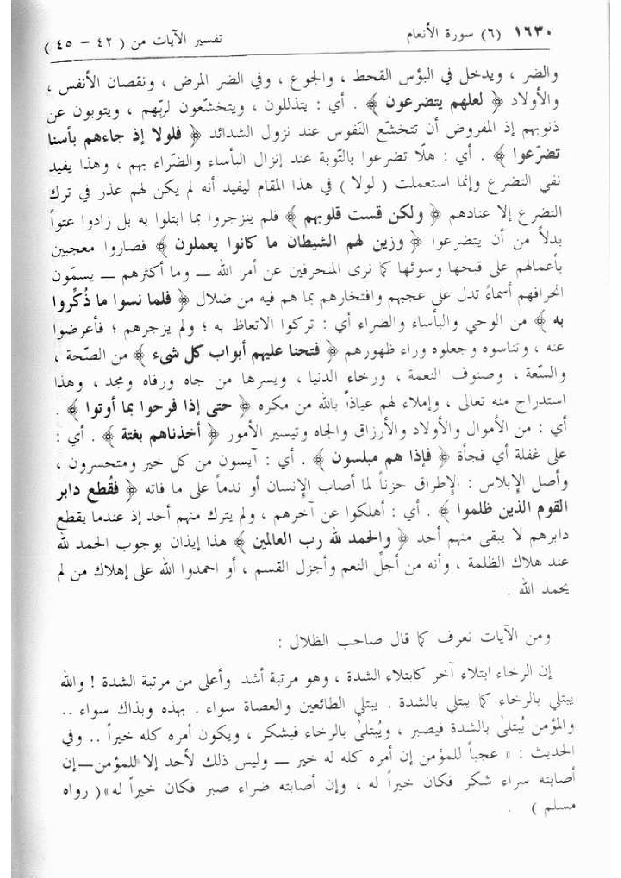 فَلَوْلا إِذْ جاءَهُمْ بَأْسُنا تَضَرَّعُوا. أي: هلّا تضرعوا بالتّوبة عند إنزال البأساء والضّراء بهم، وهذا يفيد نفي التضرع وإنما استعملت (لولا) في هذا المقام ليفيد أنه لم يكن لهم عذر في ترك التضرع إلا عنادهم وَلكِنْ قَسَتْ قُلُوبُهُمْ فلم ينزجروا بما ابتلوا به بل زادوا عتوا بدلا من أن يتضرعوا وَزَيَّنَ لَهُمُ الشَّيْطانُ ما كانُوا يَعْمَلُونَ فصاروا معجبين بأعمالهم على قبحها وسوئها كما نرى المنحرفين عن أمر الله- وما أكثرهم- يسمّون انحرافهم أسماء تدل على عجبهم وافتخارهم بما هم فيه من ضلال