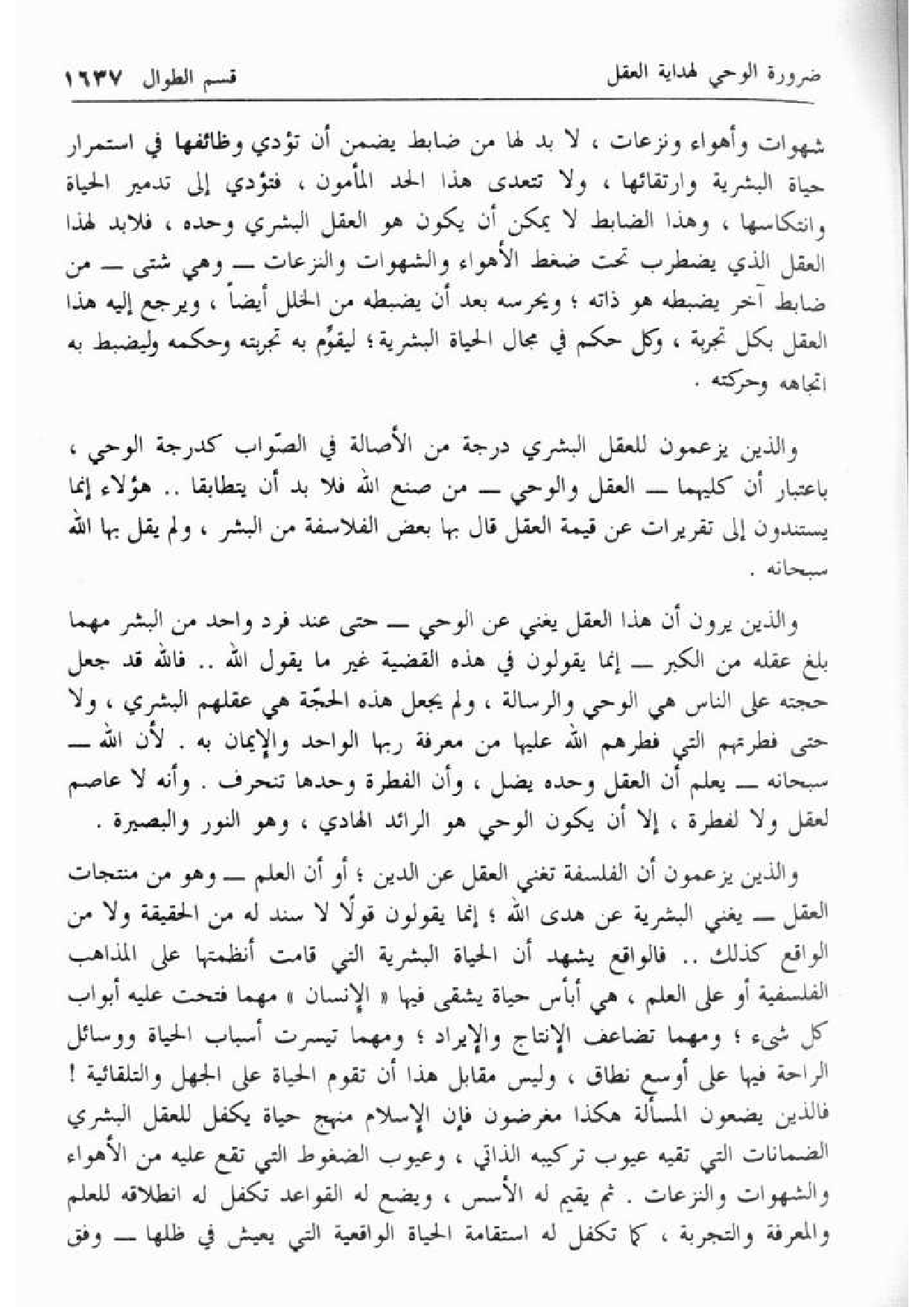 والذين يزعمون أن الفلسفة تغني العقل عن الدين؛ أو أن العلم- وهو من منتجات العقل- يغني البشرية عن هدى الله؛ إنما يقولون قولا لا سند له من الحقيقة ولا من الواقع كذلك .. فالواقع يشهد أن الحياة البشرية التي قامت أنظمتها على المذاهب الفلسفية أو على العلم، هي أبأس حياة يشقى فيها «الإنسان» مهما فتحت عليه أبواب كل شئ؛ ومهما تضاعف الإنتاج والإيراد؛ ومهما تيسرت أسباب الحياة ووسائل الراحة فيها على أوسع نطاق، وليس مقابل هذا أن تقوم الحياة على الجهل والتلقائية! فالذين يضعون المسألة هكذا مغرضون فإن الإسلام منهج حياة يكفل للعقل البشري الضمانات التي تقيه عيوب تركيبه الذاتي، وعيوب الضغوط التي تقع عليه من الأهواء والشهوات والنزعات. ثم يقيم له الأسس، ويضع له القواعد تكفل له انطلاقه للعلم والمعرفة والتجربة، كما تكفل له استقامة الحياة الواقعية التي يعيش في ظلها- وفق