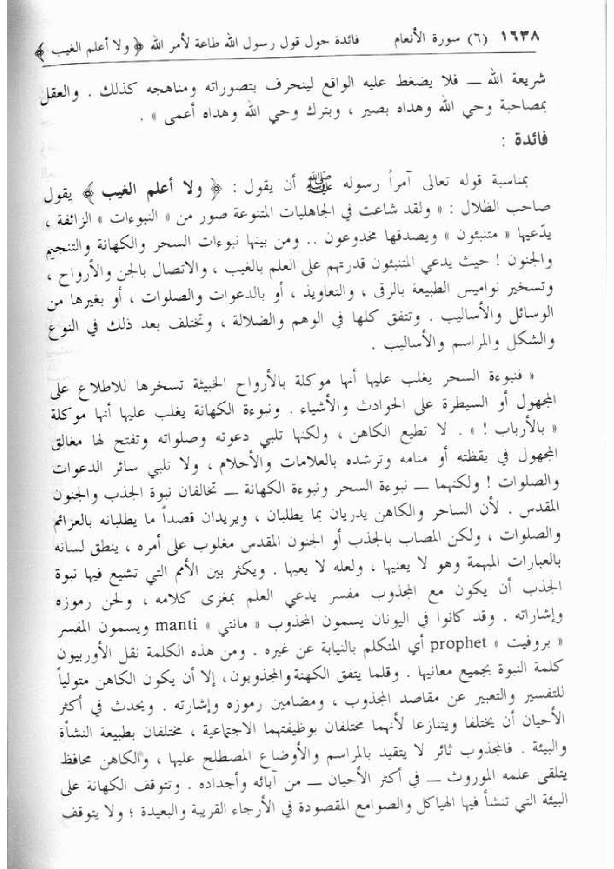 بمناسبة قوله تعالى آمرا رسوله صلّى الله عليه وسلّم أن يقول: وَلا أَعْلَمُ الْغَيْبَ يقول صاحب الظلال: «ولقد شاعت في الجاهليات المتنوعة صور من «النبوءات» الزائفة، يدّعيها «متنبئون» ويصدقها مخدوعون .. ومن بينها نبوءات السحر والكهانة والتنجيم والجنون! حيث يدعي المتنبئون قدرتهم على العلم بالغيب، والاتصال بالجن والأرواح، وتسخير نواميس الطبيعة بالرقى، والتعاويذ، أو بالدعوات والصلوات، أو بغيرها من الوسائل والأساليب. وتتفق كلها في الوهم والضلالة، وتختلف بعد ذلك في النوع والشكل والمراسم والأساليب.