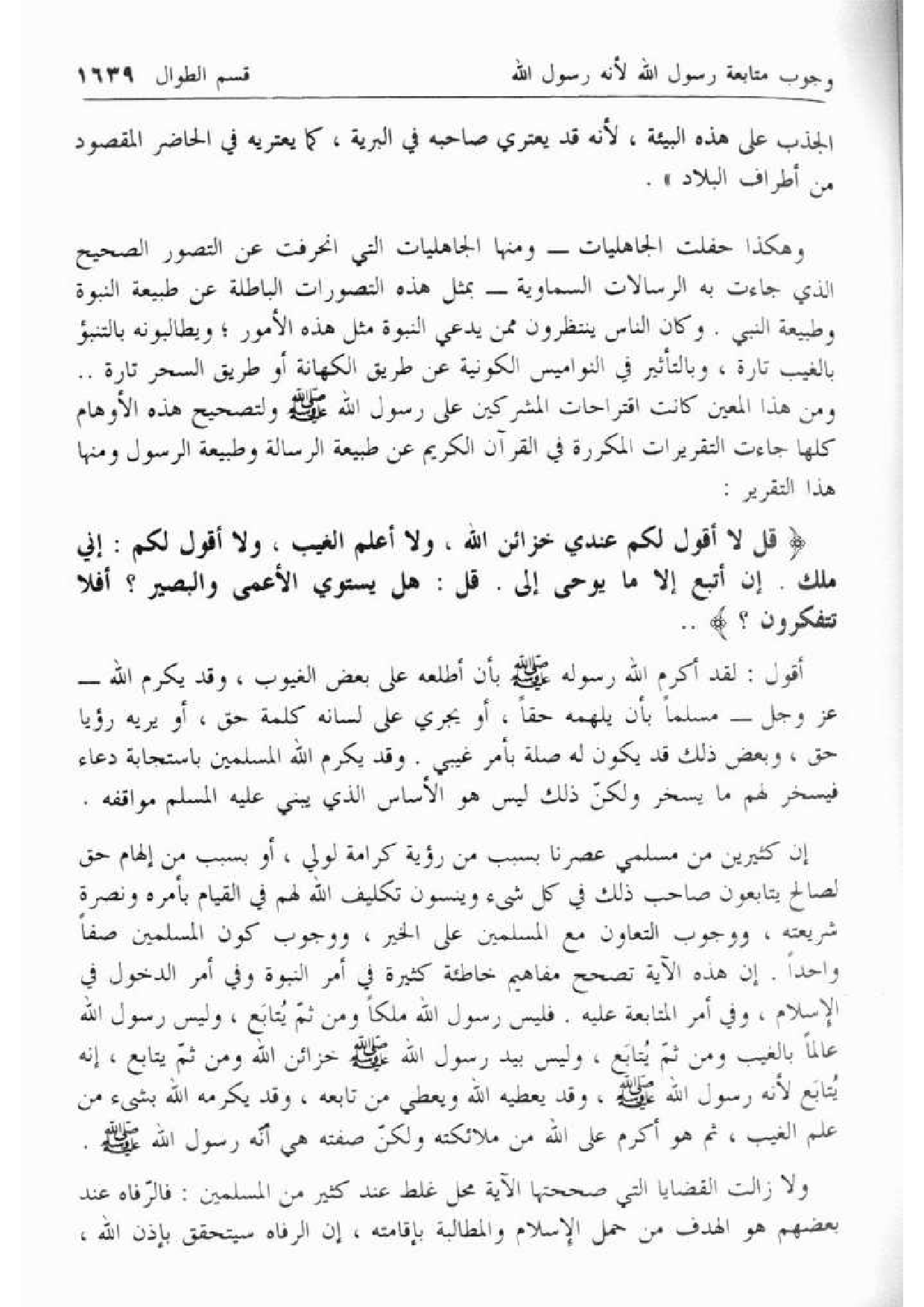 إن كثيرين من مسلمي عصرنا بسبب من رؤية كرامة لولي، أو بسبب من إلهام حق لصالح يتابعون صاحب ذلك في كل شئ وينسون تكليف الله لهم في القيام بأمره ونصرة شريعته، ووجوب التعاون مع المسلمين على الخير، ووجوب كون المسلمين صفا واحدا. إن هذه الآية تصحح مفاهيم خاطئة كثيرة في أمر النبوة وفي أمر الدخول في الإسلام، وفي أمر المتابعة عليه. فليس رسول الله ملكا ومن ثمّ يتابع، وليس رسول الله عالما بالغيب ومن ثمّ يتابع، وليس بيد رسول الله صلّى الله عليه وسلّم خزائن الله ومن ثمّ يتابع، إنه يتابع لأنه رسول الله صلّى الله عليه وسلّم، وقد يعطيه الله ويعطي من تابعه، وقد يكرمه الله بشيء من علم الغيب، ثم هو أكرم على الله من ملائكته ولكنّ صفته هي أنّه رسول الله صلّى الله عليه وسلّم.