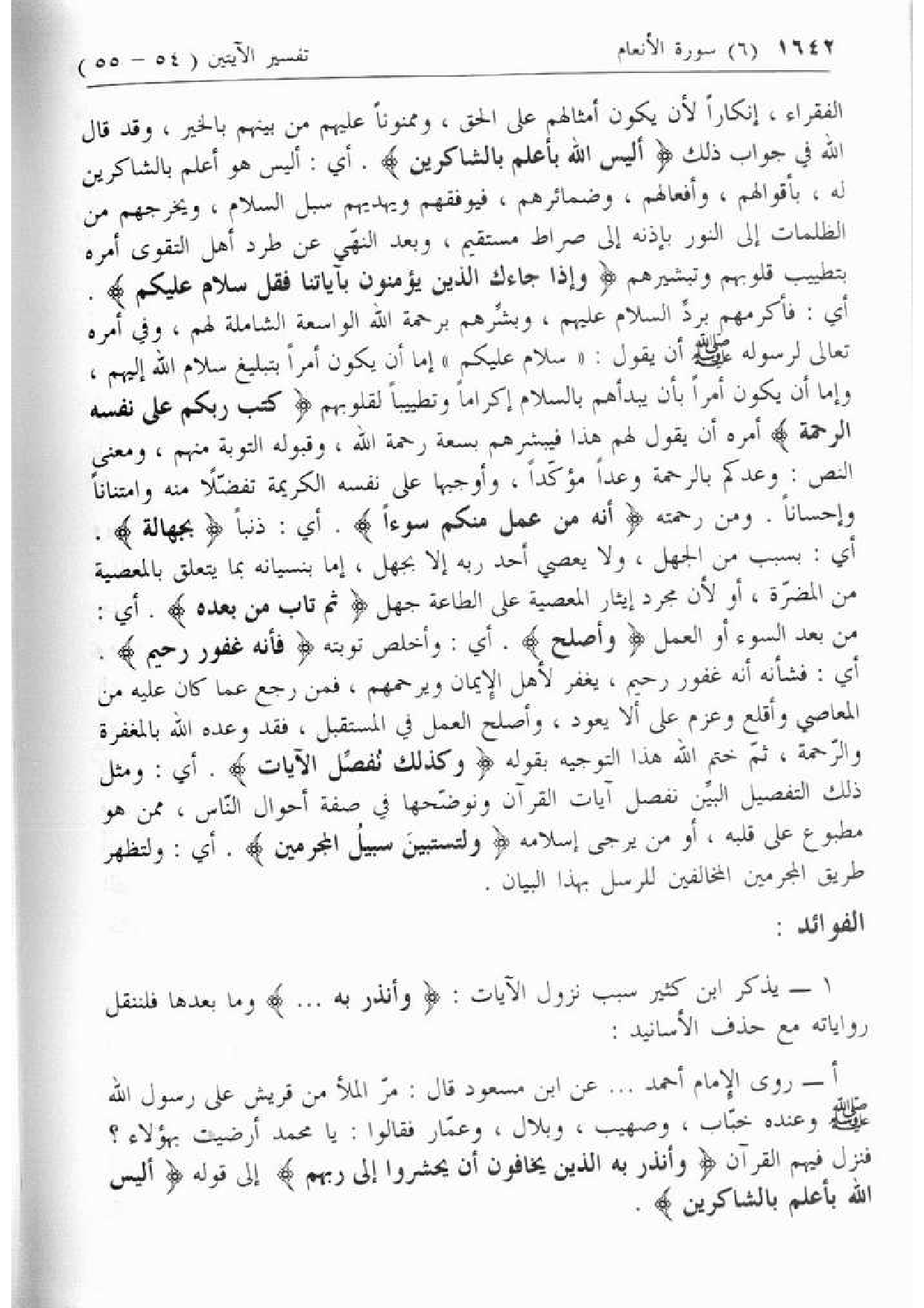 الفقراء، إنكارا لأن يكون أمثالهم على الحق، وممنونا عليهم من بينهم بالخير، وقد قال الله في جواب ذلك أَلَيْسَ اللَّهُ بِأَعْلَمَ بِالشَّاكِرِينَ. أي: أليس هو أعلم بالشاكرين له، بأقوالهم، وأفعالهم، وضمائرهم، فيوفقهم ويهديهم سبل السلام، ويخرجهم من الظلمات إلى النور بإذنه إلى صراط مستقيم، وبعد النّهي عن طرد أهل التقوى أمره بتطييب قلوبهم وتبشيرهم