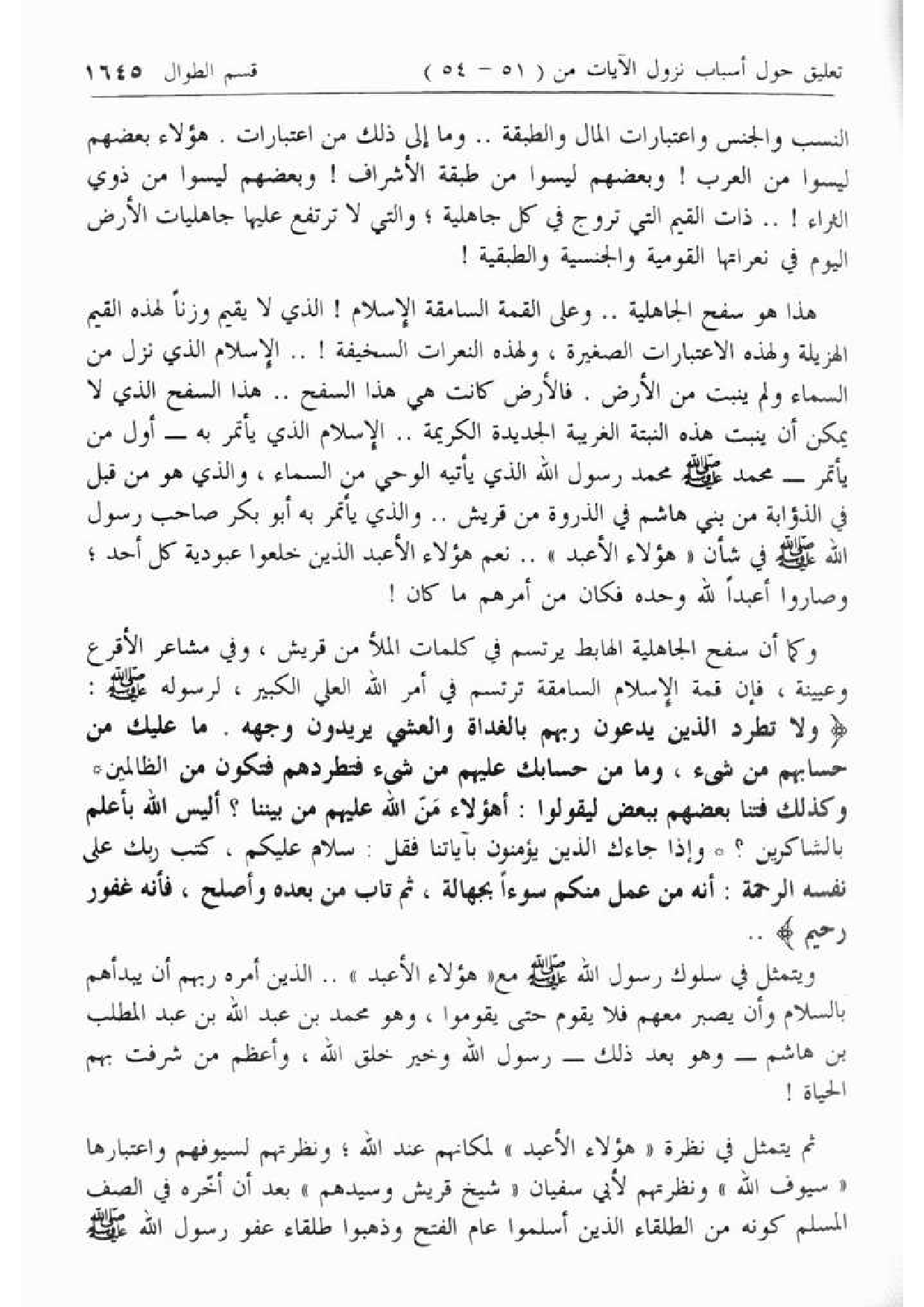 وَلا تَطْرُدِ الَّذِينَ يَدْعُونَ رَبَّهُمْ بِالْغَداةِ وَالْعَشِيِّ يُرِيدُونَ وَجْهَهُ. ما عَلَيْكَ مِنْ حِسابِهِمْ مِنْ شَيْءٍ، وَما مِنْ حِسابِكَ عَلَيْهِمْ مِنْ شَيْءٍ فَتَطْرُدَهُمْ فَتَكُونَ مِنَ الظَّالِمِينَ* وَكَذلِكَ فَتَنَّا بَعْضَهُمْ بِبَعْضٍ لِيَقُولُوا: أَهؤُلاءِ مَنَّ اللَّهُ عَلَيْهِمْ مِنْ بَيْنِنا؟ أَلَيْسَ اللَّهُ بِأَعْلَمَ بِالشَّاكِرِينَ؟ * وَإِذا جاءَكَ الَّذِينَ يُؤْمِنُونَ بِآياتِنا فَقُلْ: سَلامٌ عَلَيْكُمْ، كَتَبَ رَبُّكُمْ عَلى نَفْسِهِ الرَّحْمَةَ: أَنَّهُ مَنْ عَمِلَ مِنْكُمْ سُوءاً بِجَهالَةٍ، ثُمَّ تابَ مِنْ بَعْدِهِ وَأَصْلَحَ، فَأَنَّهُ غَفُورٌ رَحِيمٌ ..