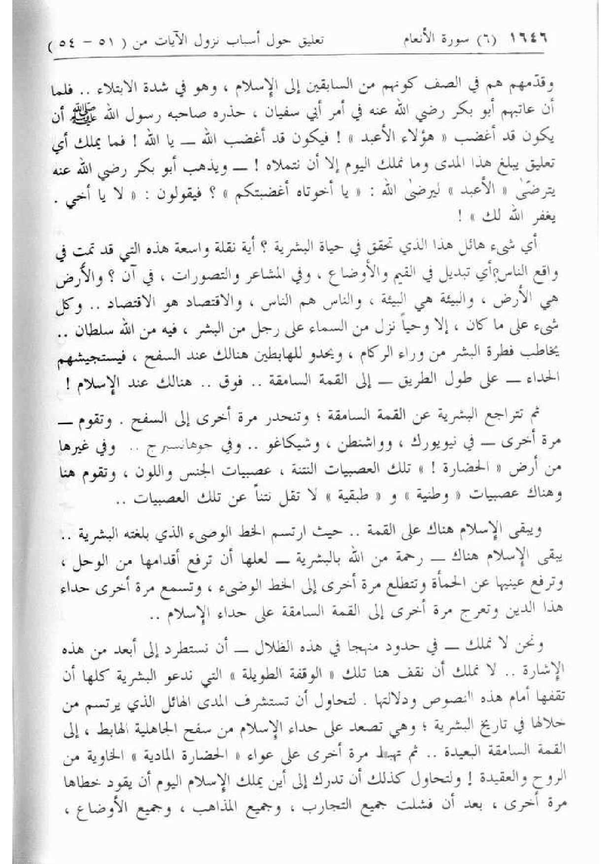 ونحن لا نملك- في حدود منهجا في هذه الظلال- أن نستطرد إلى أبعد من هذه الإشارة .. لا نملك أن نقف هنا تلك «الوقفة الطويلة» التي ندعو البشرية كلها أن تقفها أمام هذه النصوص ودلالتها. لتحاول أن تستشرف المدى الهائل الذي يرتسم من خلالها في تاريخ البشرية؛ وهي تصعد على حداء الإسلام من سفح الجاهلية الهابط، إلى القمة السامقة البعيدة .. ثم تهبط مرة أخرى على عواء «الحضارة المادية» الخاوية من الروح والعقيدة! ولتحاول كذلك أن تدرك إلى أين يملك الإسلام اليوم أن يقود خطاها مرة أخرى، بعد أن فشلت جميع التجارب، وجميع المذاهب، وجميع الأوضاع،