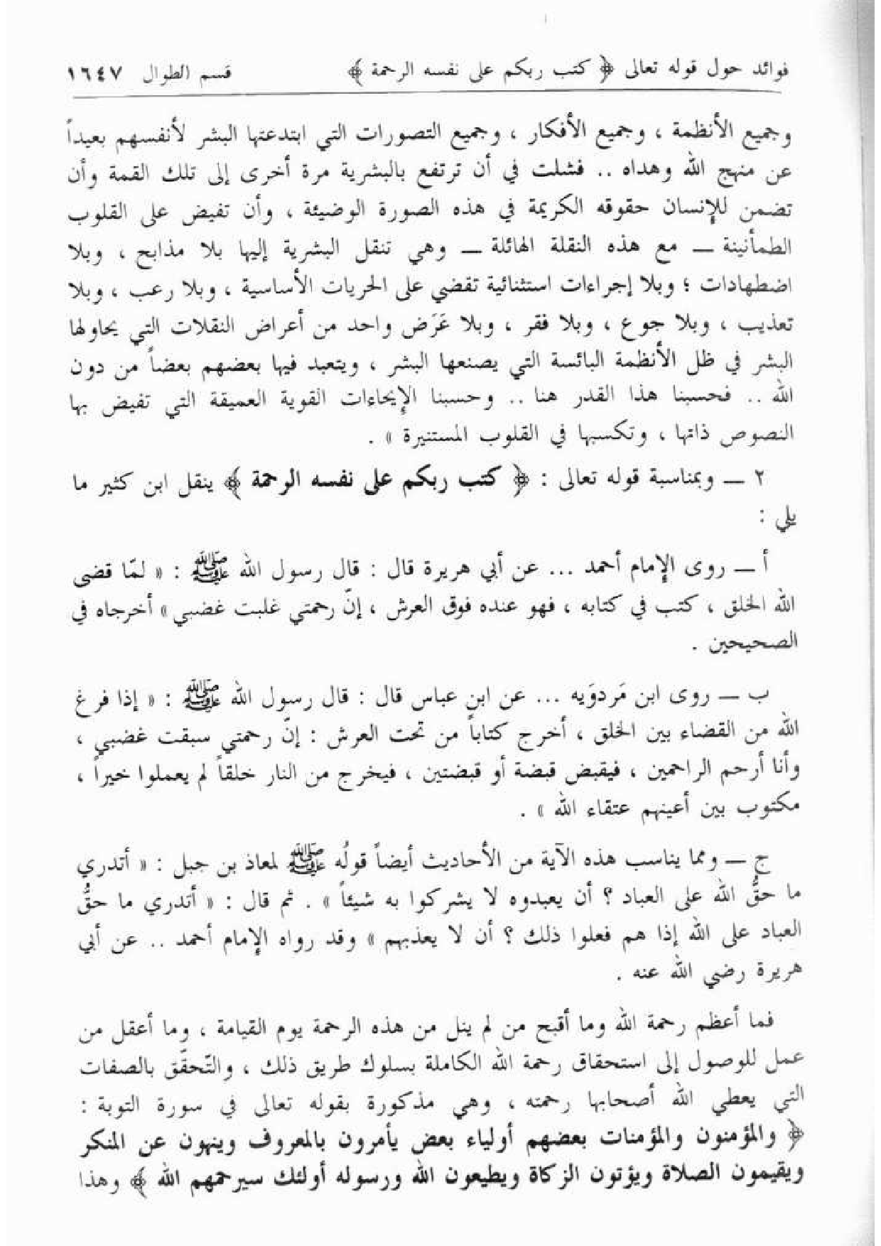 وبمناسبة قوله تعالى: كَتَبَ رَبُّكُمْ عَلى نَفْسِهِ الرَّحْمَةَ ينقل ابن كثير ما يلي:
